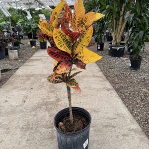 The vibrant 09″ Croton Picasso’s Paintbrush features multicolored, leathery leaves ideal for adding a pop of color to interiorscapes and retail displays. With its bold coloration and unique leaf shapes, this plant attracts attention effortlessly. Easy-care for beginners and experts alike, it thrives with moderate watering and bright, indirect light. Perfect for brightening up any space.
