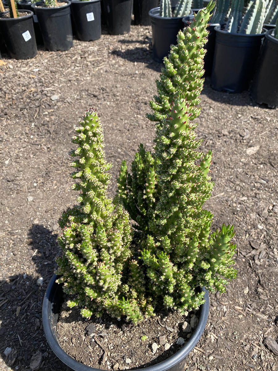 The Austrocylindropuntia Subulata features cylindrical stems adorned with golden spines, creating a striking visual display. Perfect for exterior landscapers looking for drought-tolerant plants with a unique shape and texture. Also ideal for retail garden centers to attract attention with its eye-catching appearance.