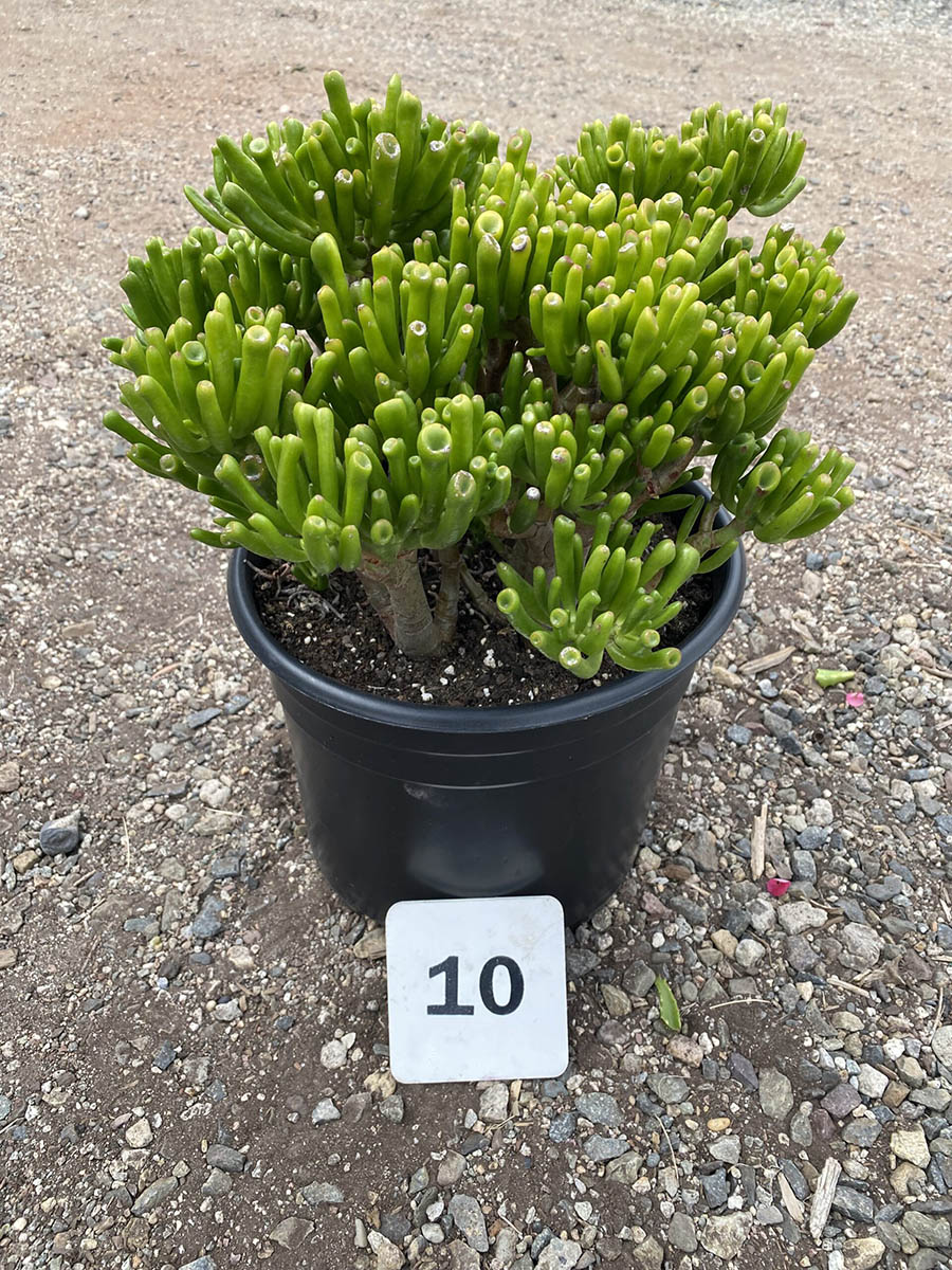 The Crassula Ovata Gollum features unique tubular leaves with a green hue, resembling fingers. This succulent is perfect for interiorscapes and retail displays, adding a touch of whimsy and easy-care charm. Its water needs are minimal, requiring infrequent watering. Thrives in medium to bright light conditions with easy general care.