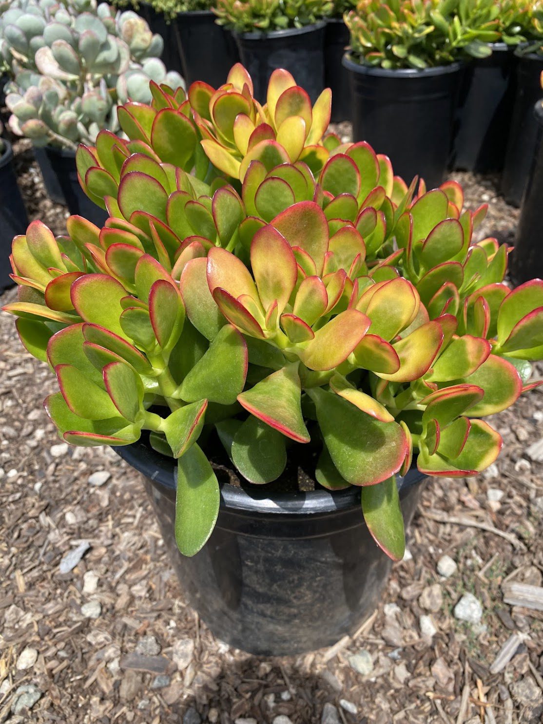 The Crassula Ovata Sunset features striking orange and red hues on its fleshy leaves, creating a captivating display for retail environments. This drought-tolerant plant thrives in bright light and dry conditions, making it an attractive choice for water-wise landscapes. Water: 1, Light: 3, General Care: 1