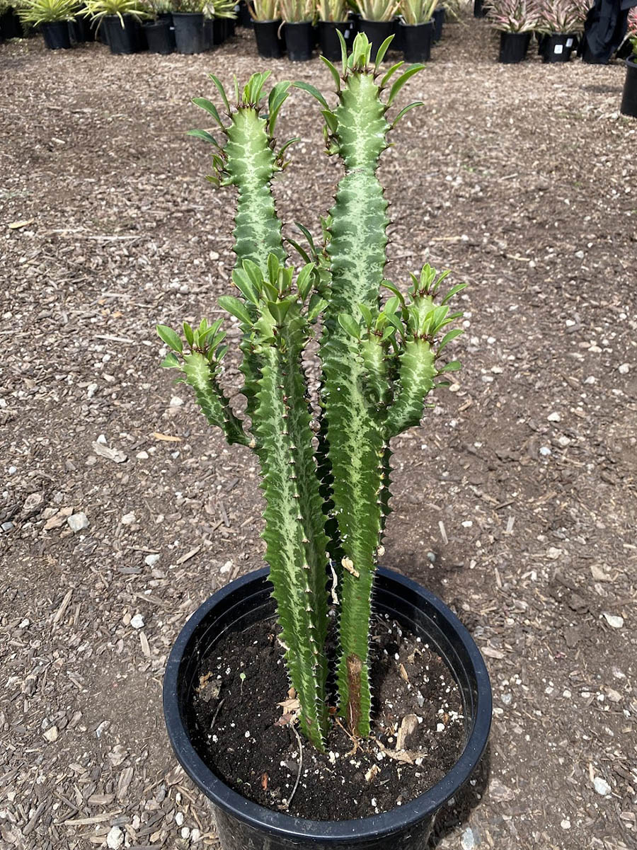 With its tall, columnar shape and striking green color, the Euphorbia Trigona ‘Green’ is an eye-catching choice for both landscapers and garden centers. This plant is excellent for creating vertical interest in outdoor spaces and retail settings. Drought-tolerant and low-maintenance, it is ideal for busy professionals and trendy plant enthusiasts.
