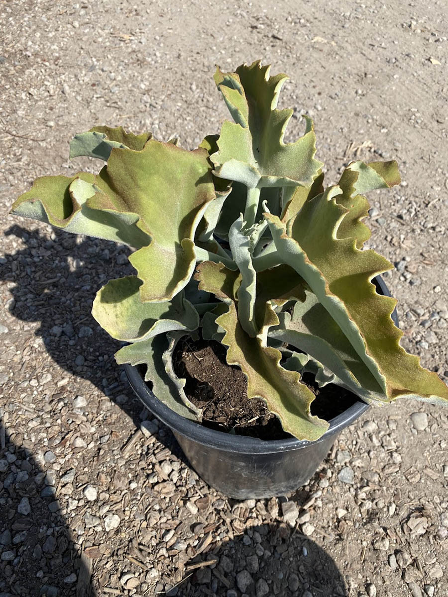 The Kalanchoe Beharensis features velvety, triangular leaves in shades of silver-green, making it a statement piece in outdoor landscapes or retail garden centers. This drought-tolerant plant thrives in bright light and infrequent watering, ideal for adding texture and color to various settings. Its unique appearance appeals to both landscaping professionals and retail buyers seeking distinctive plants.
