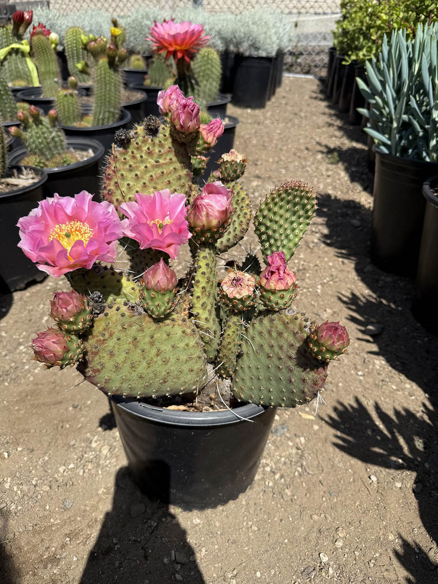 The Opuntia Pink Frost is a stunning cactus with pink pads and white spines, creating a captivating visual display. Ideal for both landscapers and garden centers, this variety adds a pop of color and texture to any setting. Water: 1, Light: 3, General Care: 1