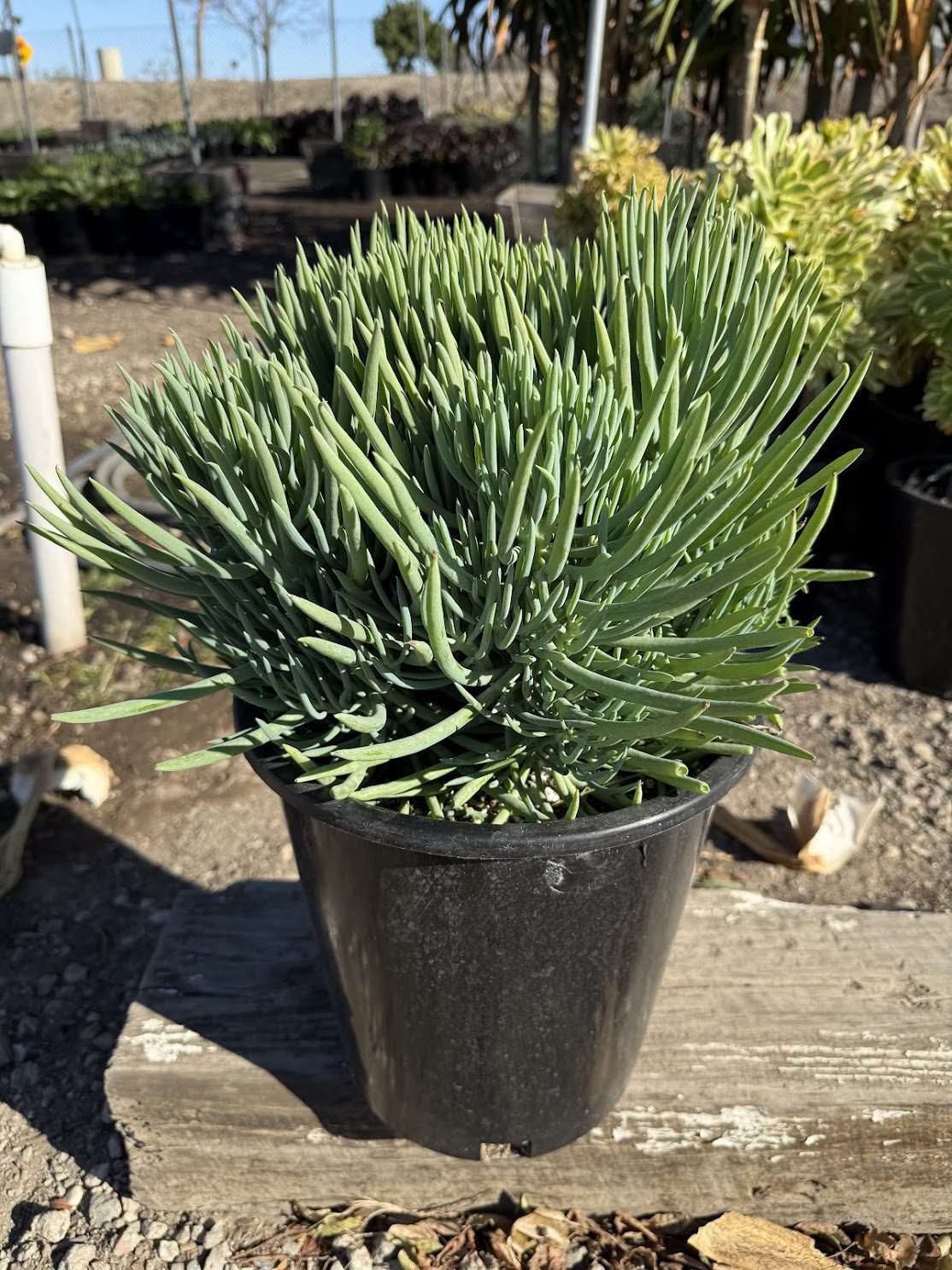The Senecio Vitalis, also known as the “Blue Chalk Sticks,” features unique blue-green cylindrical leaves that add a touch of elegance to any landscape or retail setting. This drought-tolerant plant thrives in bright light and requires minimal water, making it a low-maintenance choice for both landscapers and garden centers. Ideal for creating cascading effects in containers or rock gardens, this plant offers a striking visual impact for outdoor spaces.