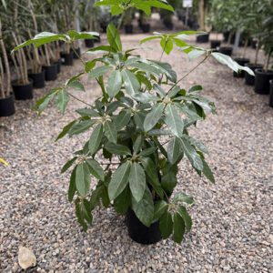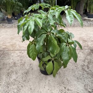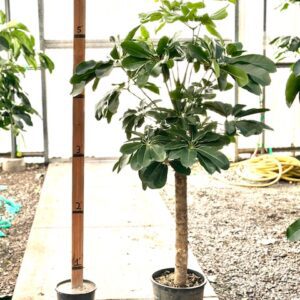 The 10″ Tupidanthus is a compact bush plant reaching 3′ tall, featuring vibrant green foliage that adds a pop of color to interiorscapes and retail environments. With moderate watering needs and a preference for bright light, this plant is a versatile choice for various setups. Its bushy form and easy-care requirements make it suitable for creating lush green displays that capture attention and require minimal maintenance.