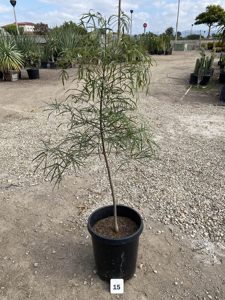 The majestic 15G Brachychiton Rupestris features a lush canopy of vibrant green foliage, perfect for exterior landscapers seeking a resilient shade tree. Its large, heart-shaped leaves provide seasonal interest, while its sturdy trunk offers structural appeal in various outdoor settings. With moderate watering needs and a preference for bright light, this tree is a standout choice for creating inviting outdoor environments.
