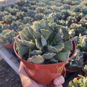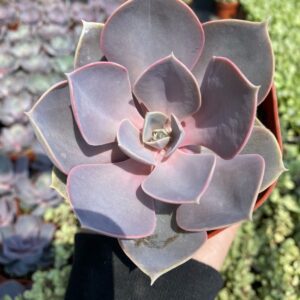 A striking succulent, the Aeonium Urbicum features rosettes of dark green leaves tinged with burgundy, creating a dramatic contrast. This hardy plant is perfect for both exterior landscapes and retail displays, adding a touch of elegance. With minimal water requirements and moderate light preferences, it is an easy-care choice for beginners and professionals alike.