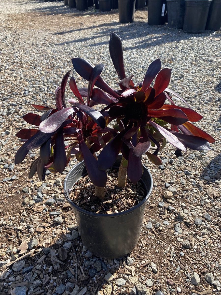 Aeonium Zwartkop features striking rosettes of dark, almost black, foliage that contrast beautifully with its green centers. This succulent is perfect for adding drama to retail displays and drought-tolerant garden arrangements. With minimal watering needs and a preference for bright light, it is an excellent choice for beginners.