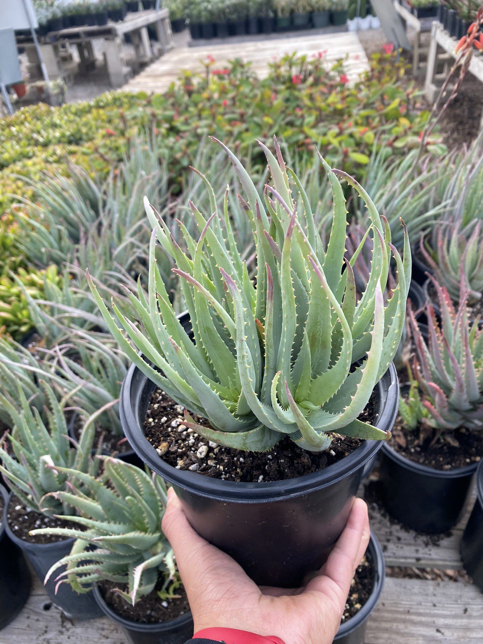A favorite among exterior landscapers, the Aloe Blue Elf features striking blue-green foliage accented with white spots and spiky margins. This succulent adds a pop of color to drought-prone gardens and thrives in sunny locations. Perfect for dry garden beds, rock gardens, or xeriscapes.