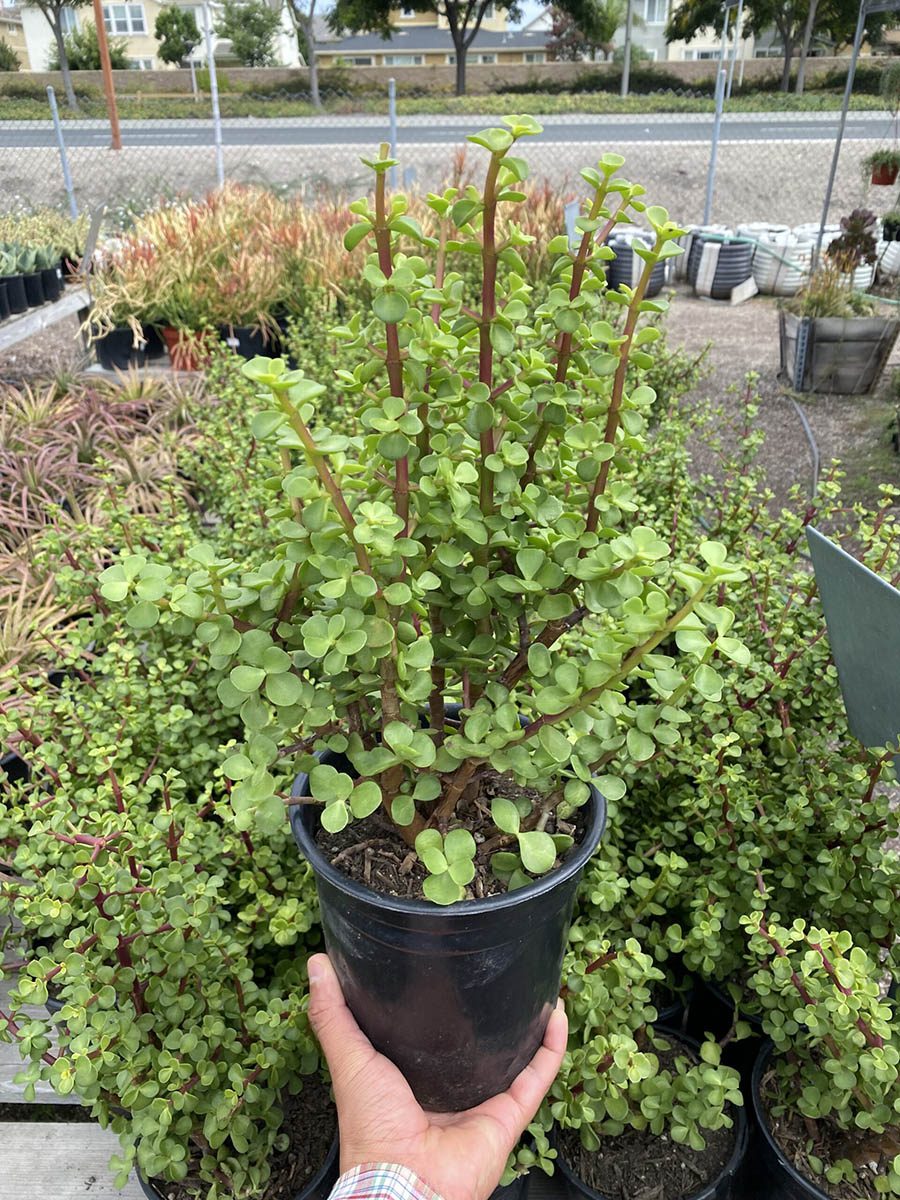 Portulacaria Afra, also known as Elephant Bush, is a versatile plant with small, rounded green leaves that resemble a miniature jade plant. Ideal for both interior and exterior landscapers, this drought-tolerant succulent thrives in various light conditions. Also suitable for retail garden centers due to its appealing appearance and ease of care. Water: 2, Light: 2, General Care: 1