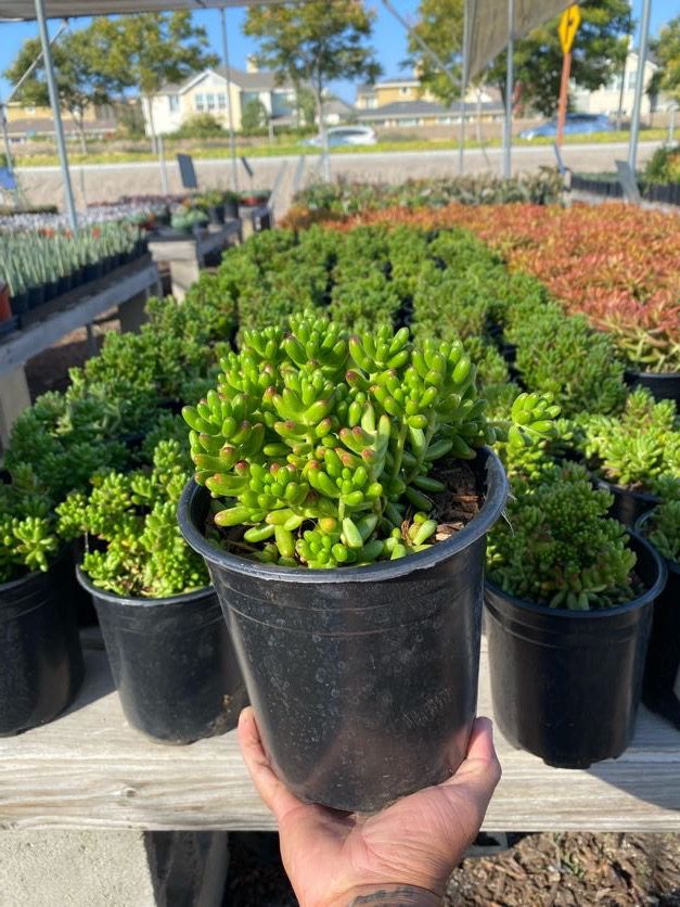 With its vibrant green leaves tinged with red edges, the Sedum rubrotintum adds a pop of color to any exterior landscape or retail display. This hardy succulent is perfect for drought-prone areas and requires minimal maintenance, making it an excellent choice for both landscapers and garden centers. Ideal for ground cover and adding texture to arrangements.