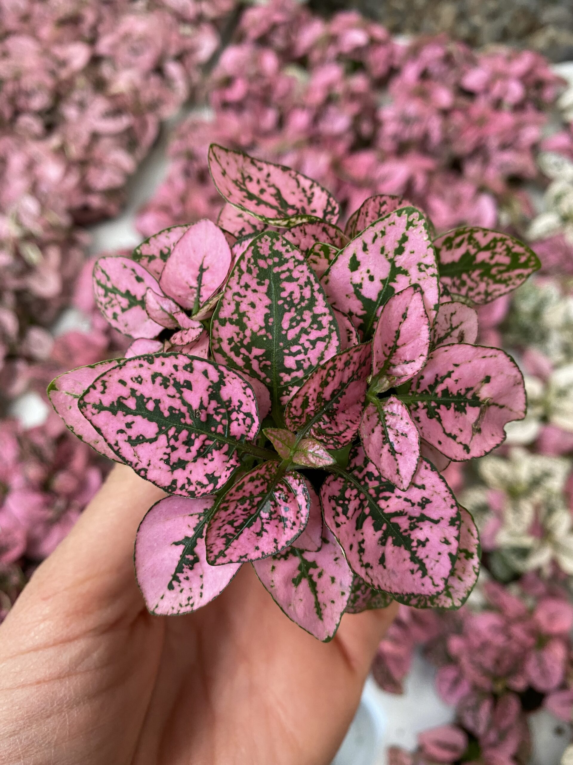 The 2″ Hypoestes ‘Rose Splash’ features vibrant green leaves splashed with pink hues, adding a pop of color to interiorscapes and retail displays. Its compact size makes it perfect for small spaces and desktops. With minimal water and moderate light requirements, this plant is excellent for beginners. Ideal for adding a touch of whimsy and freshness to any setting.