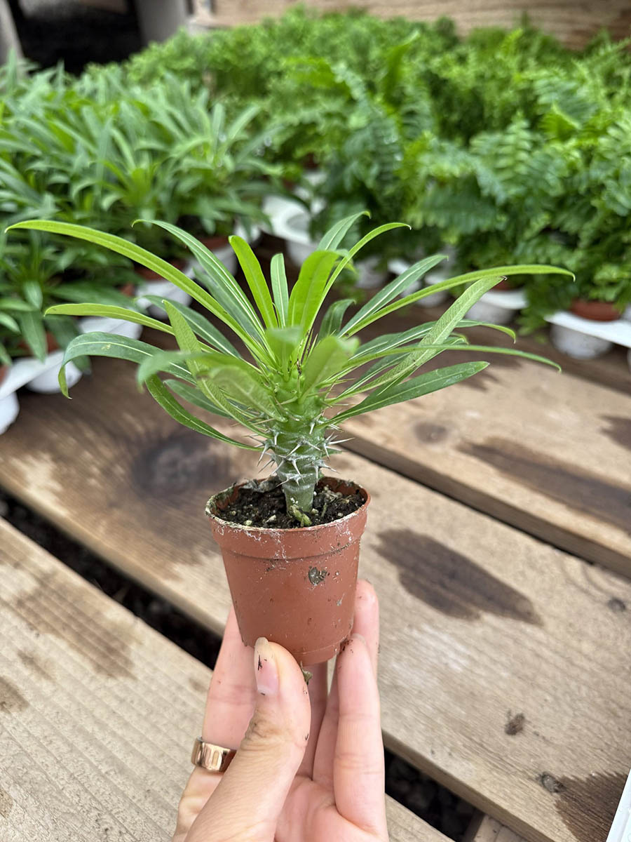 The 2″ Pachypodium Lamerei is a striking succulent with a tall, slender green stem topped with clusters of small, leathery leaves. Its unique shape and minimal water needs make it a perfect choice for interiorscape designs seeking a touch of the exotic. This plant thrives in bright light conditions and requires minimal care, ideal for both professionals and retail settings looking to add a tropical flair.
