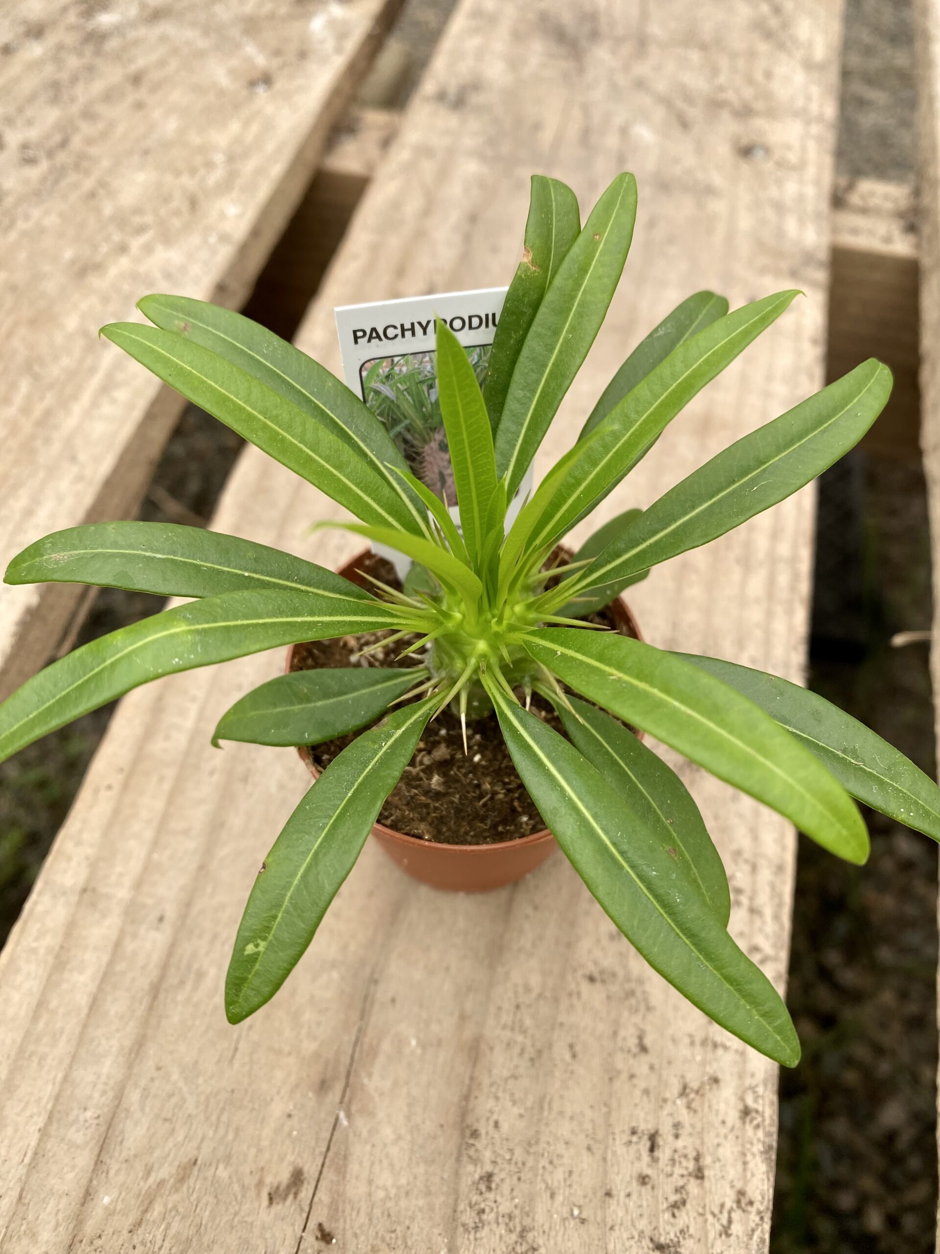 Meet the unique Pachypodium Lamerii, a striking succulent with thick green stems and spiky leaves. This plant is a conversation starter, ideal for adding a touch of drama to interiorscapes or retail shelves. With its minimal water requirements and preference for bright light, it’s a low-maintenance choice for eye-catching displays.