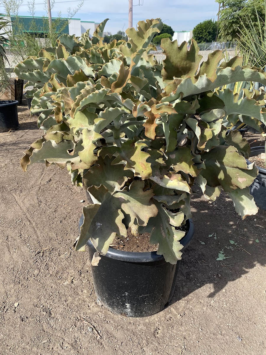 The Kalanchoe Beharensis is a striking succulent known for its large, paddle-shaped leaves with a velvety texture and unique grey-green coloration. This plant is perfect for adding visual interest to both interior and exterior landscapes. With moderate water needs and bright light requirements, it is a versatile choice for landscapers and garden centers looking to offer something distinctive.