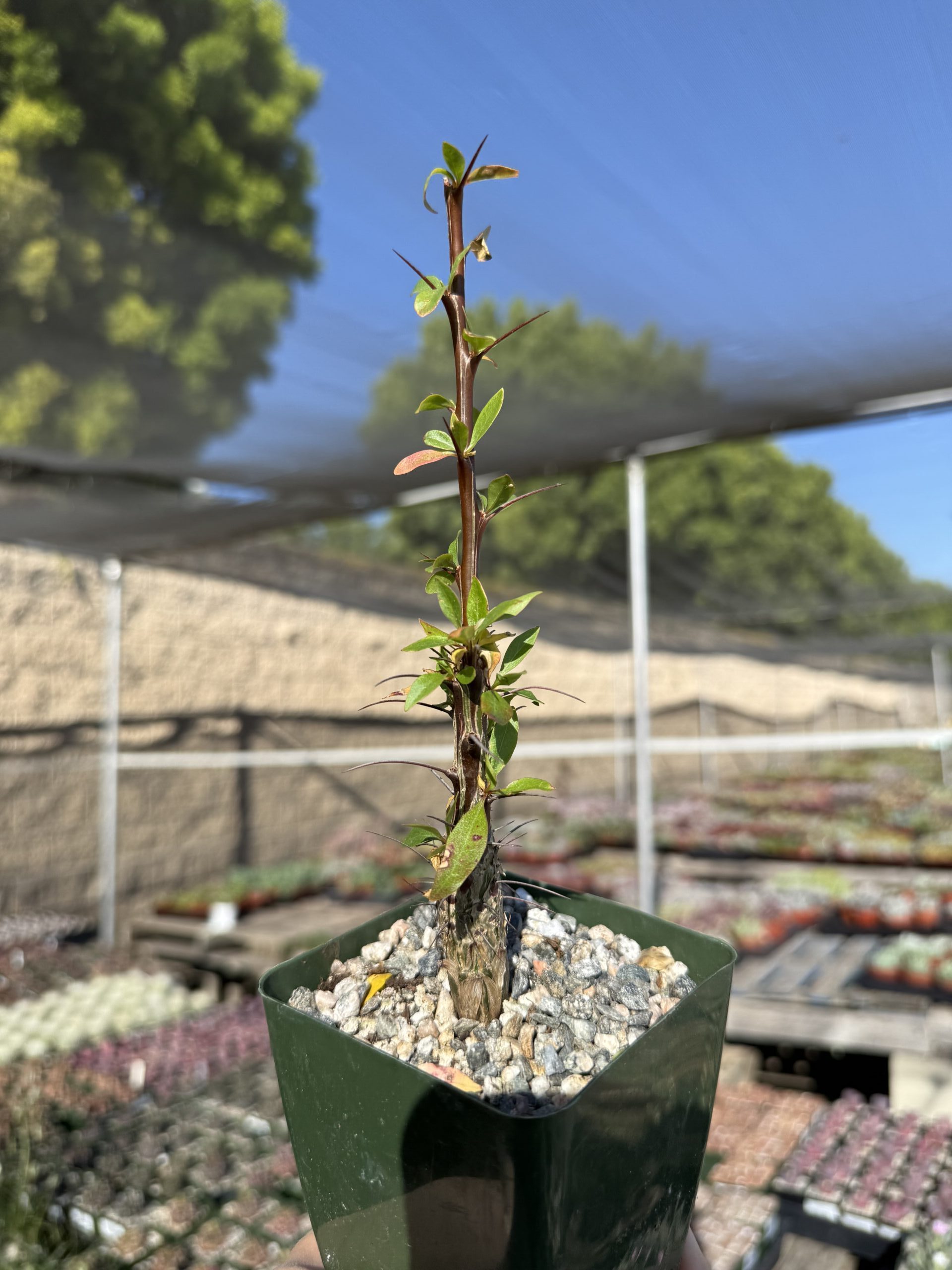 The Fouquieria macdougalii SQ features unique twisted stems covered in spines and beautiful red flowers that thrive in outdoor landscapes. Perfect for exterior landscapers seeking a drought-tolerant, low-maintenance plant with striking desert aesthetic. Ideal for sunny, well-drained areas.