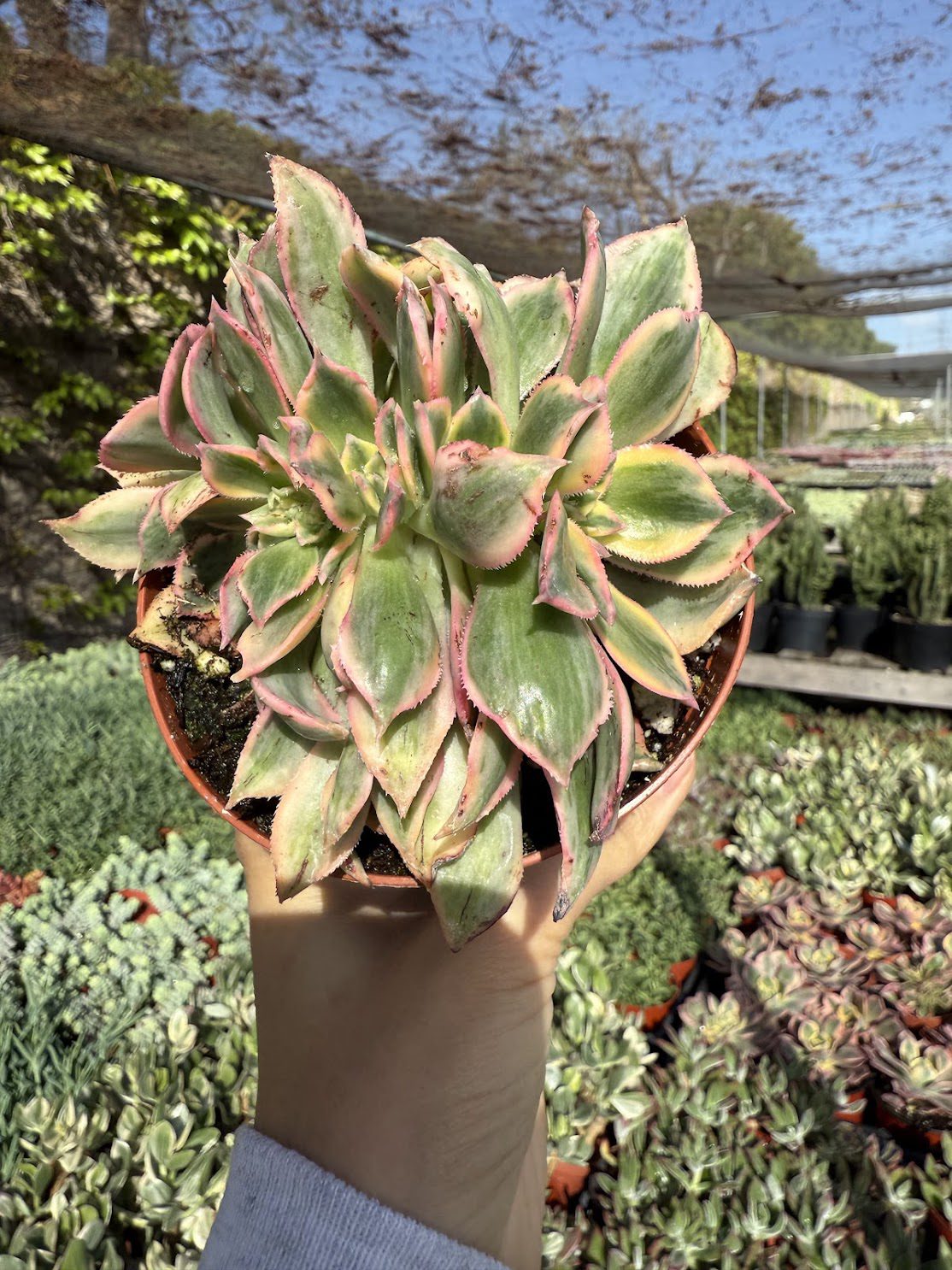 The Aeonium Sunburst Crested features striking yellow-green rosettes with red edges on a textured trunk, adding a pop of color to any space. Ideal for interiorscapes and retail settings, this succulent requires moderate water and bright light. Easy-care plant that enhances visual interest effortlessly.