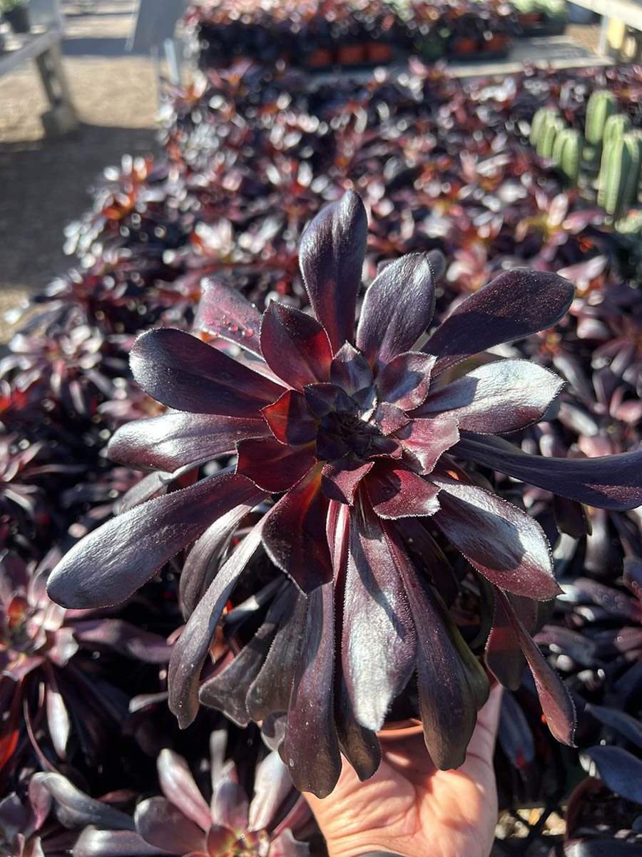 The Aeonium Zwartkop boasts stunning rosettes of dark purple leaves that create a dramatic contrast in any garden or retail display. Low-maintenance and drought-tolerant, this plant is a popular choice for both professionals and beginners. Ideal for adding bold color and texture to landscapes while requiring minimal care.