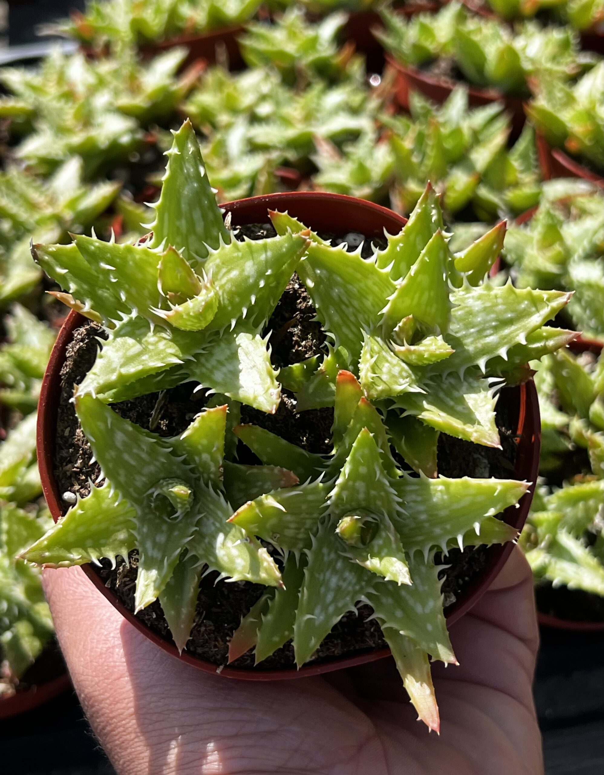 A striking succulent, the 4″ Aloe Juvenna features slender green leaves adorned with white spots, creating a visually captivating look. Perfect for interiorscapes and retail displays, this plant thrives in bright light and requires moderate watering. Ideal for adding a touch of desert charm to any setting.