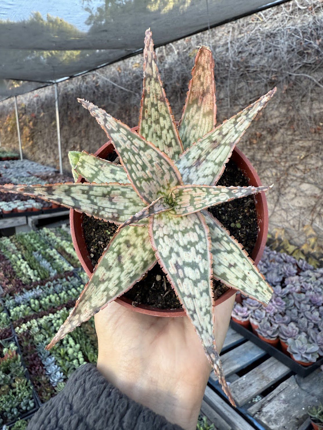 Aloe White Lightning is a striking succulent with white-speckled leaves and a pop of coral color. Ideal for adding visual interest to displays, this plant requires moderate watering and bright light. Suitable for eye-catching retail arrangements.
