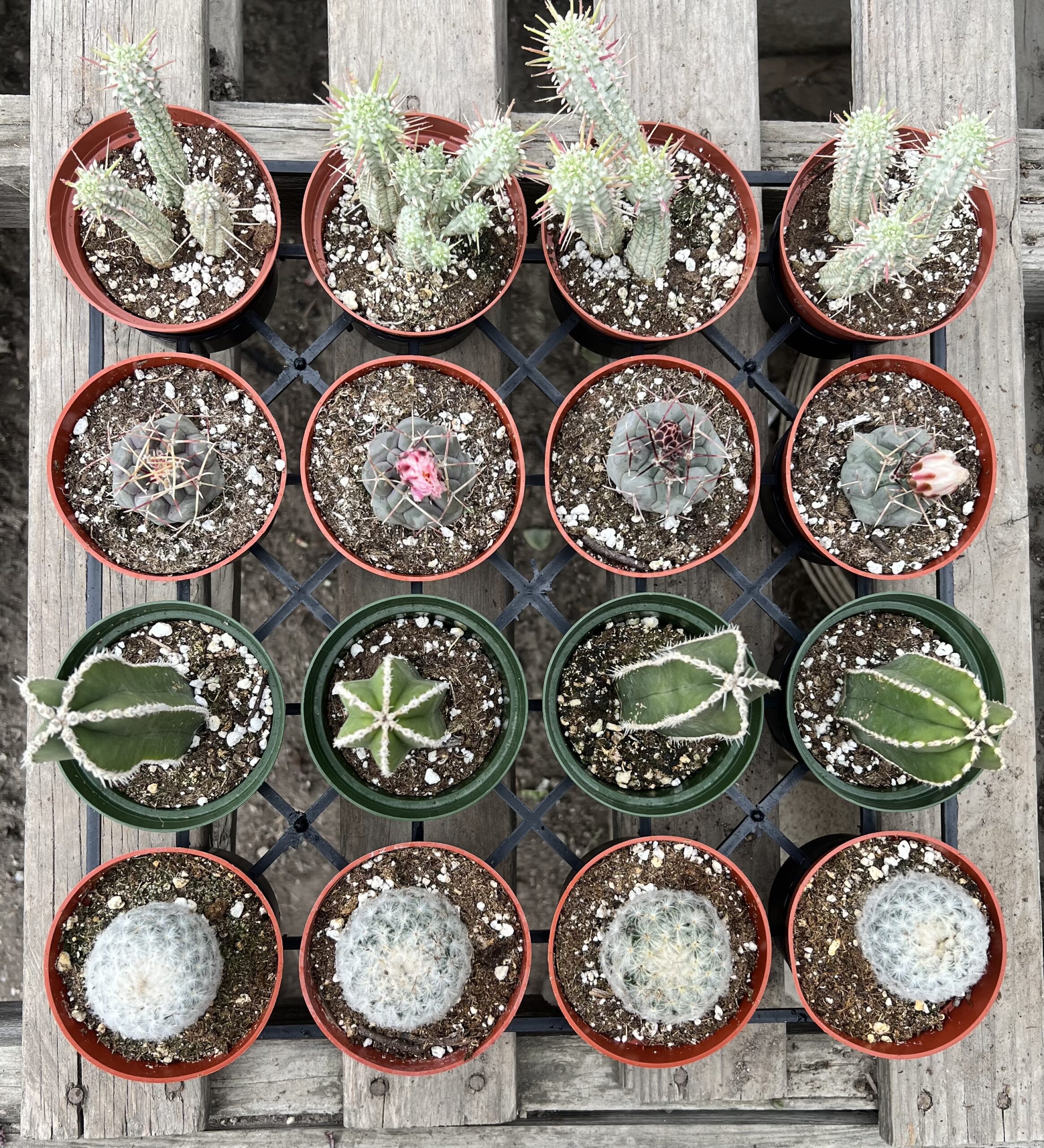The flat of 16 assorted 4″ Cacti is a versatile option for both exterior landscapers and retail garden centers. These cacti, each unique in shape and color, are well-suited for various outdoor environments due to their drought tolerance (water: 1). With a brightness rating of 3 and an easy general care rating of 1, these cacti thrive in full sun and require minimal attention. Ideal for creating desert-inspired landscapes or eye-catching retail displays. Its vibrant colors and varied shapes make it a popular choice for landscaping projects and consumer appeal.