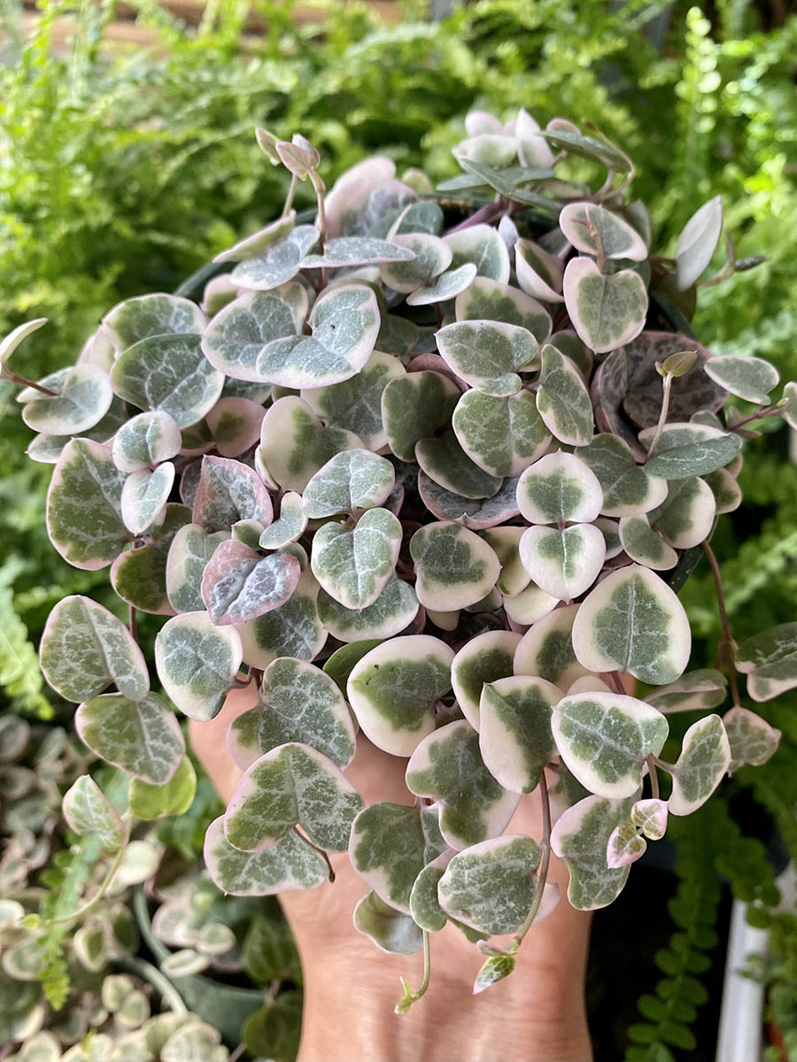 The 4″ Variegated Ceropegia ‘String of Hearts’ is a charming trailing plant with heart-shaped leaves adorned in shades of green and cream, adding a touch of elegance to interiorscapes and retail spaces. Requiring moderate water and bright light, this plant flourishes in hanging baskets or as a tabletop accent, making it a popular choice for both beginners and plant enthusiasts. Its unique beauty and easy care make it a must-have for any plant collection.