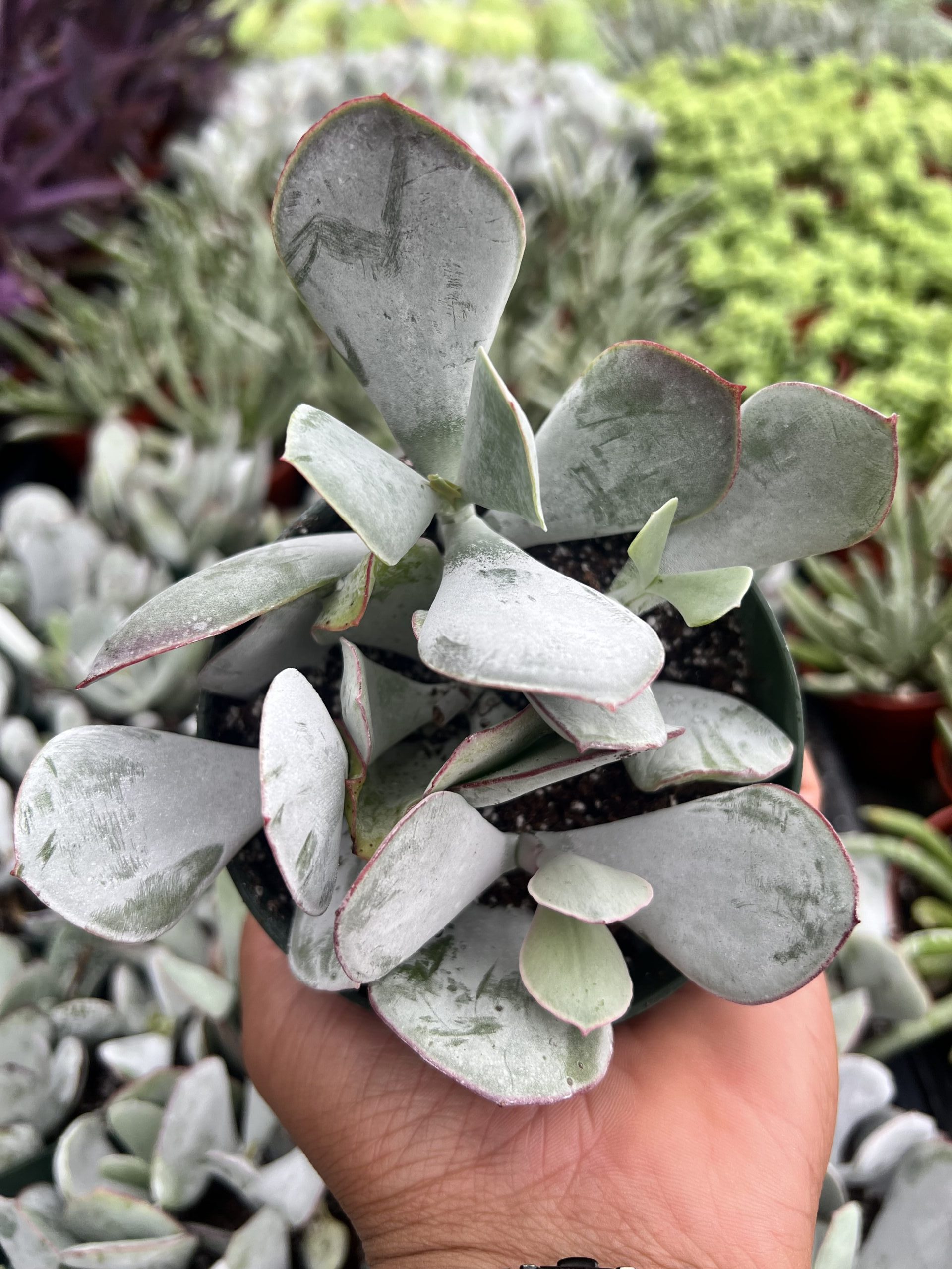 The Cotyledon Orbiculata features rounded, silver-green leaves with a velvety texture, making it a standout choice for both exterior landscapers and retail garden centers. This succulent thrives in bright light and requires minimal water, making it easy to care for even for beginners. Perfect for creating eye-catching displays in gardens or retail settings.