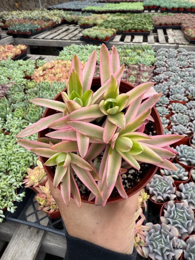 The Crassula Campfire ‘Variegated’ is a charming succulent with brightly colored leaves that transition from green to fiery red tips. This low-maintenance plant is excellent for interiorscapes and retail shelves, offering a pop of color and visual interest. With minimal water and bright light preferences, it’s an easy-care choice for creating eye-catching displays for customers seeking vibrant succulents.
