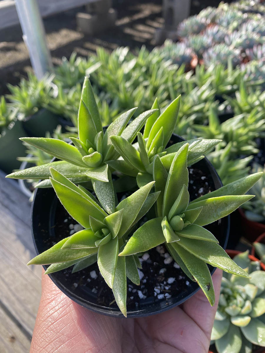 The 4″ Crassula Capitella, also known as ‘Campfire Plant’, showcases vibrant red tips on its succulent green leaves, adding a pop of color to any outdoor space. Perfect for ground cover and erosion control in various outdoor landscapes, it requires minimal watering and prefers bright, indirect light. A must-have for eye-catching arrangements.