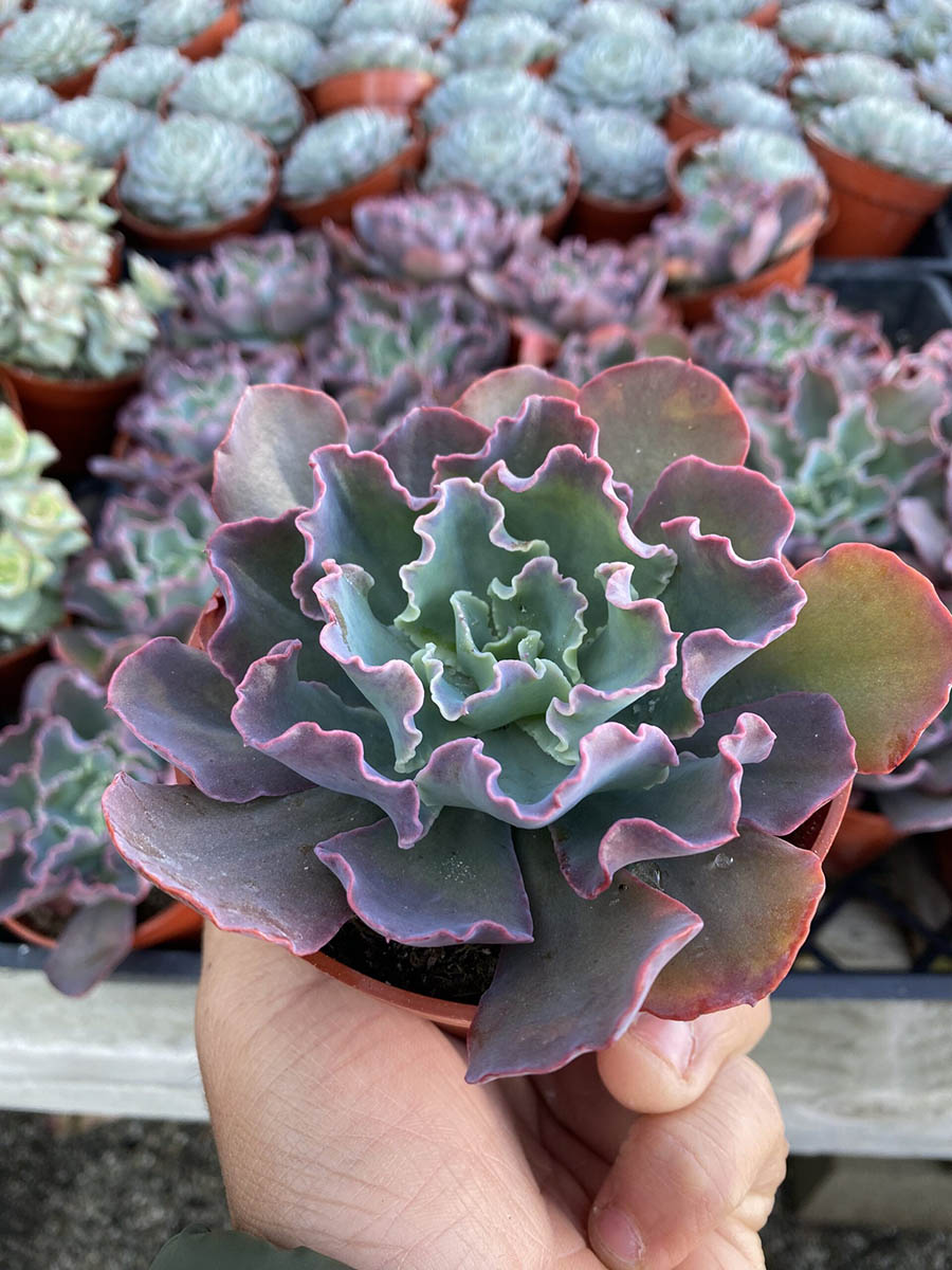 With its stunning blue-tinged leaves curling gracefully, the Echeveria Blue Curls brings a touch of whimsy to any garden or retail space. This succulent is perfect for creating eye-catching displays and requires minimal maintenance, making it a favorite among enthusiasts. Water: 1, Light: 2, General Care: 1