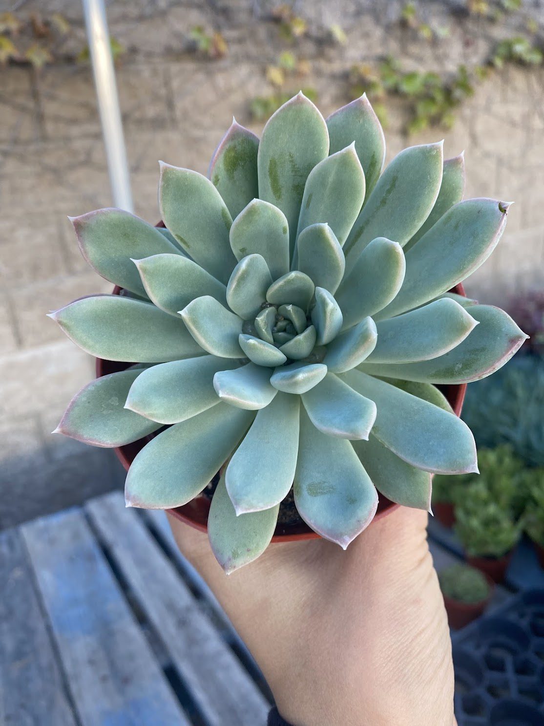 The Echeveria Moon Fairy boasts delicate, rosette-shaped leaves with a silvery-blue hue, creating a whimsical aesthetic for landscaping projects and retail settings. Its compact size makes it ideal for small spaces, while its low water and moderate light requirements ensure effortless care for both professionals and hobbyists.