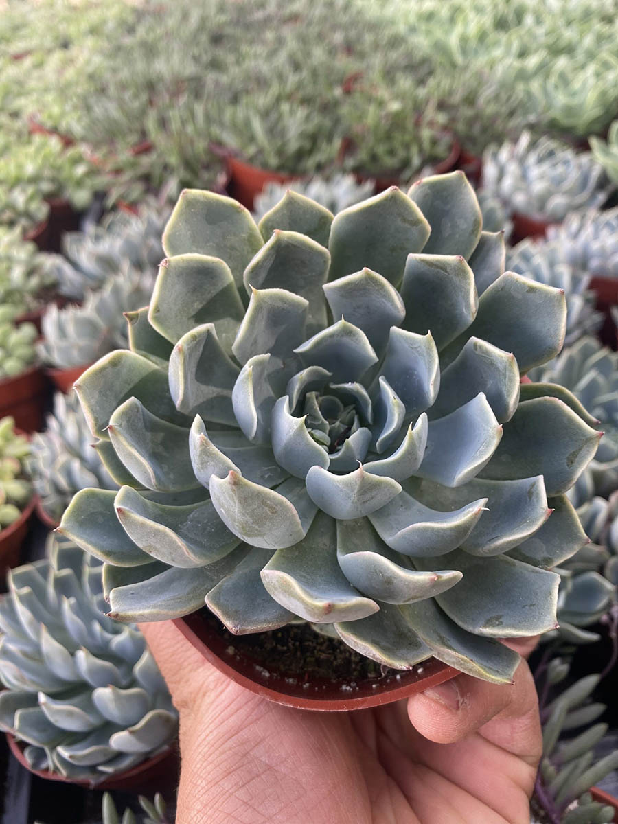 The Echeveria Secunda Hybrid showcases rosettes of fleshy, blue-green leaves with pink accents, adding a touch of elegance to residential landscapes or retail shelves. Thriving with infrequent watering and bright light, this succulent is an excellent choice for low-maintenance gardening.