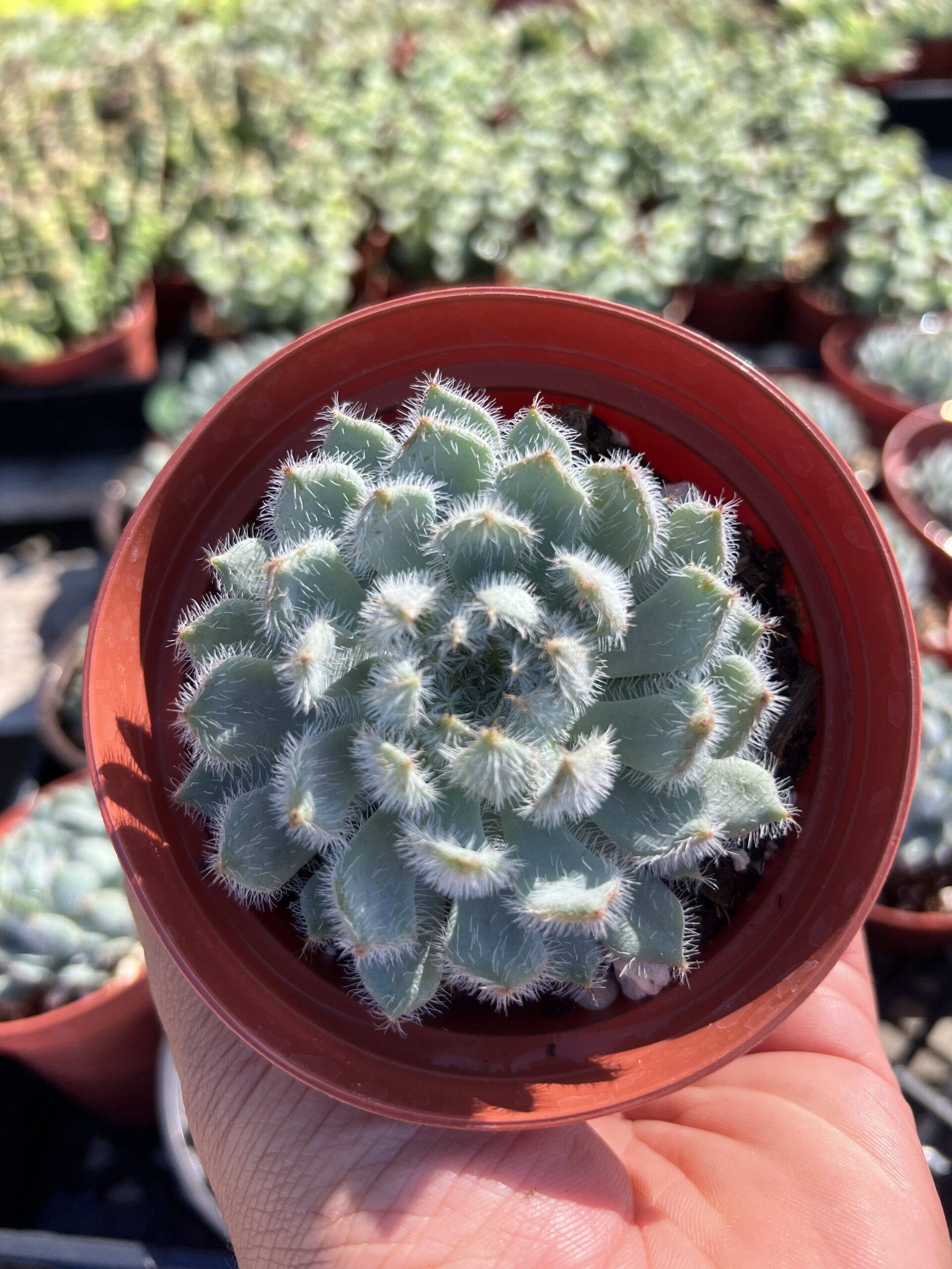 With its rosette shape and fuzzy leaves, the Echeveria Setosa stands out for its unique texture and striking silver-green color. Ideal for both interiorscapes and retail displays, it adds a touch of whimsy to any space. Requires moderate watering and bright indirect light. Easy to care for, making it perfect for beginners.