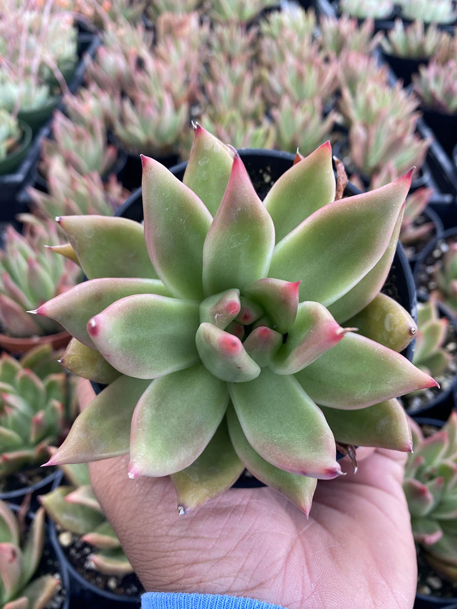 The 4″ Echeveria Agavoides ‘Super Red’ boasts vibrant red-toned rosettes with pointed leaves, offering a bold and eye-catching addition to outdoor landscapes or retail shelves. Thriving in bright light and well-draining soil, this succulent requires minimal watering and care, making it a versatile and attractive choice for succulent enthusiasts and landscaping professionals alike.