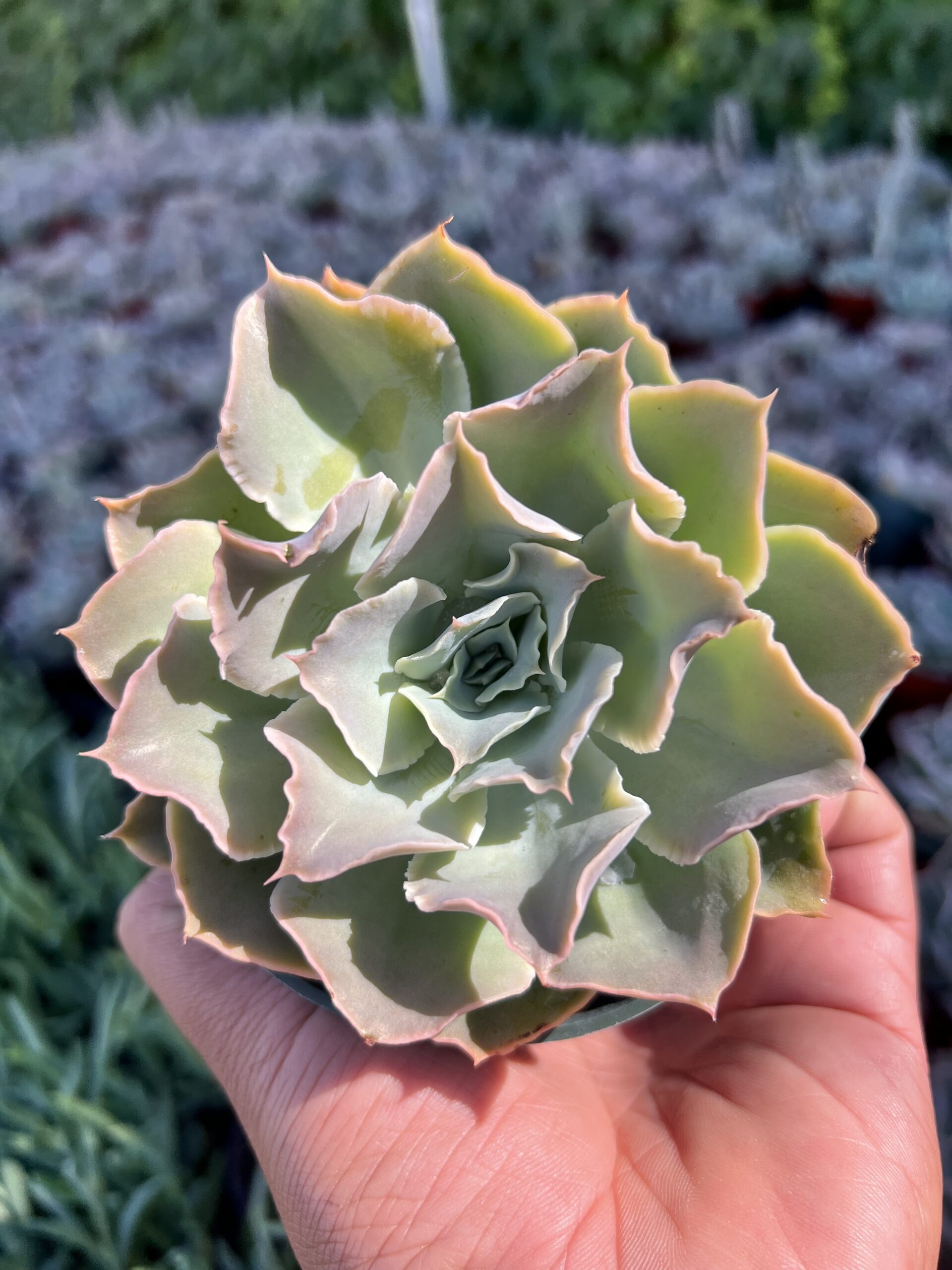 The 4″ Echeveria ‘Water Ripple’ features rosettes of blue-green leaves with delicate ruffled edges, resembling rippling water. This unique succulent adds a touch of elegance to any landscape or retail space, making it a popular choice among plant enthusiasts. Thriving in bright light and minimal water, this stunning Echeveria is perfect for both indoor and outdoor settings, bringing beauty and charm to any environment.