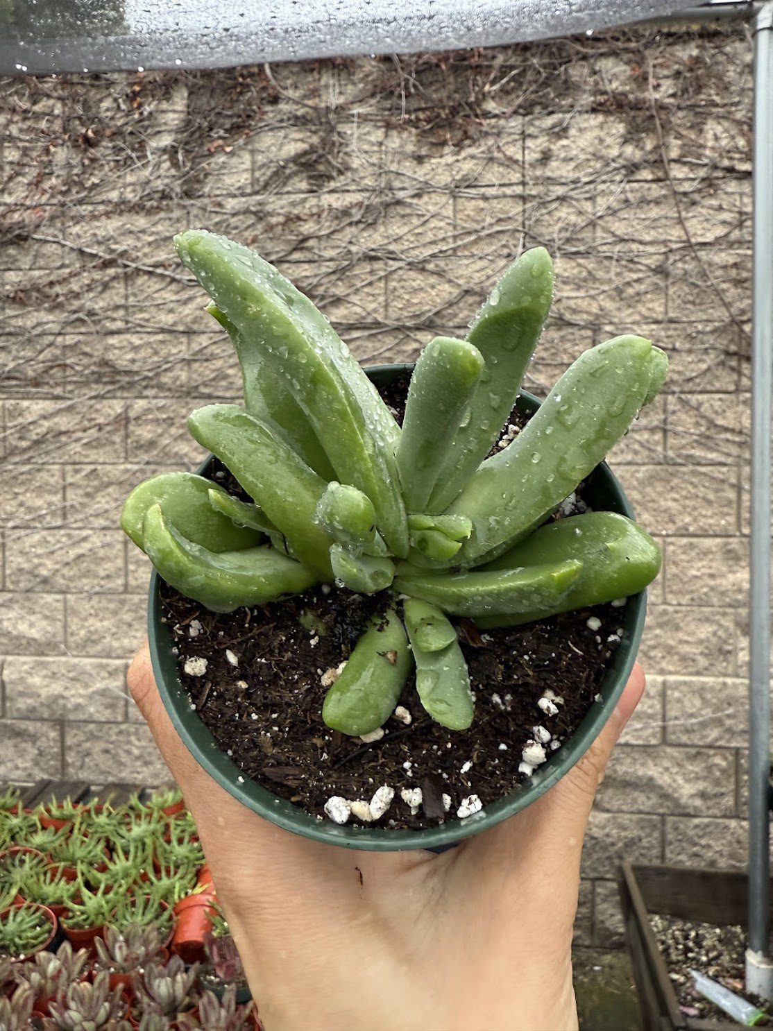 The Glottiphyllum longum features distinctive, elongated leaves with a vibrant green hue, adding a unique touch to interior plant displays. This low-maintenance succulent is a great choice for landscaping projects and retail sales, thriving in bright light conditions with minimal watering needs.