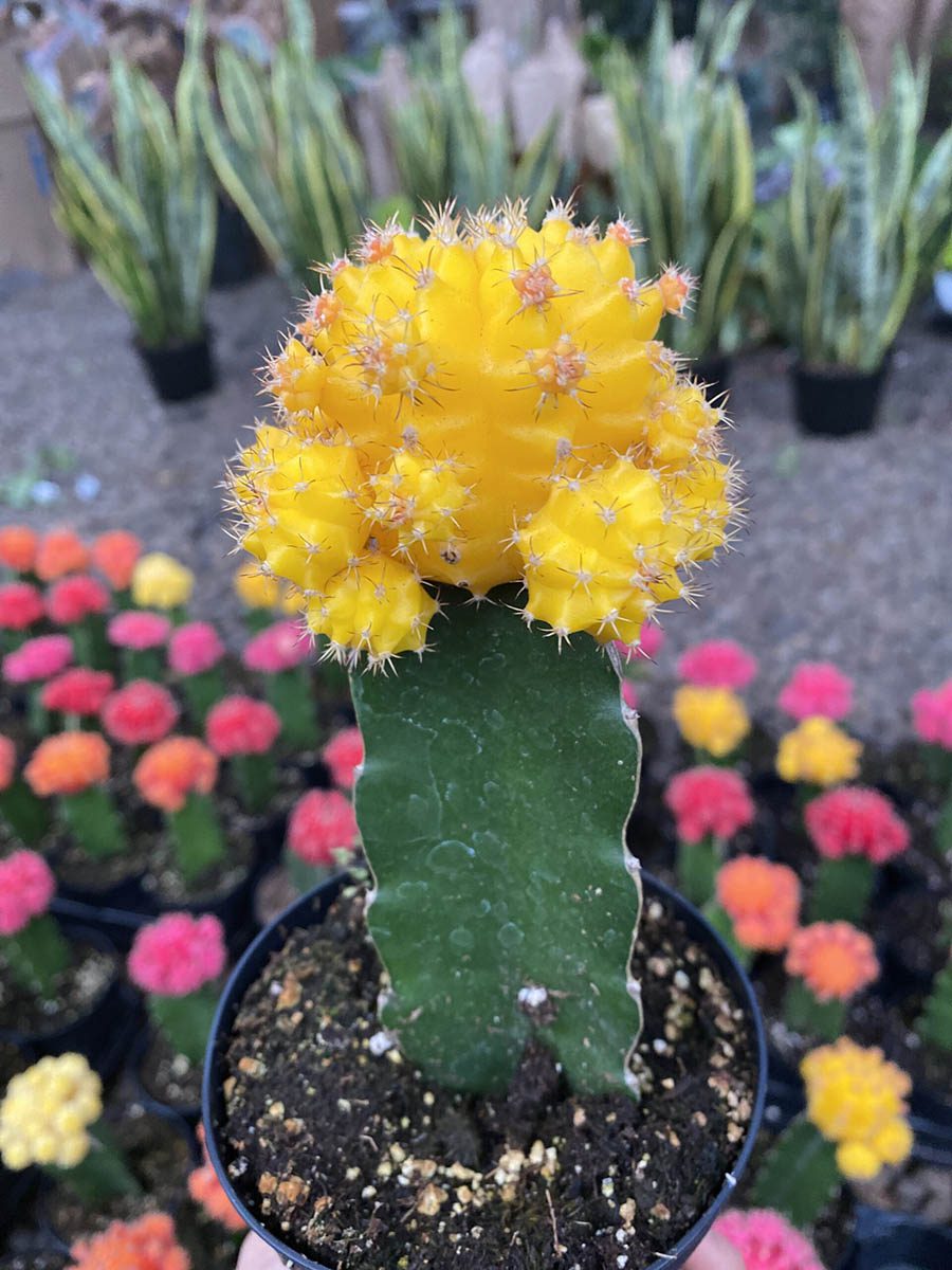 A splash of yellow atop a sturdy stem makes this grafted cactus a standout in any display. Its vivid hue and unique form draw the eye, ideal for retail settings or interiorscape focal points. Requires negligible maintenance, thriving in bright and medium light. A resilient choice for varied conditions.