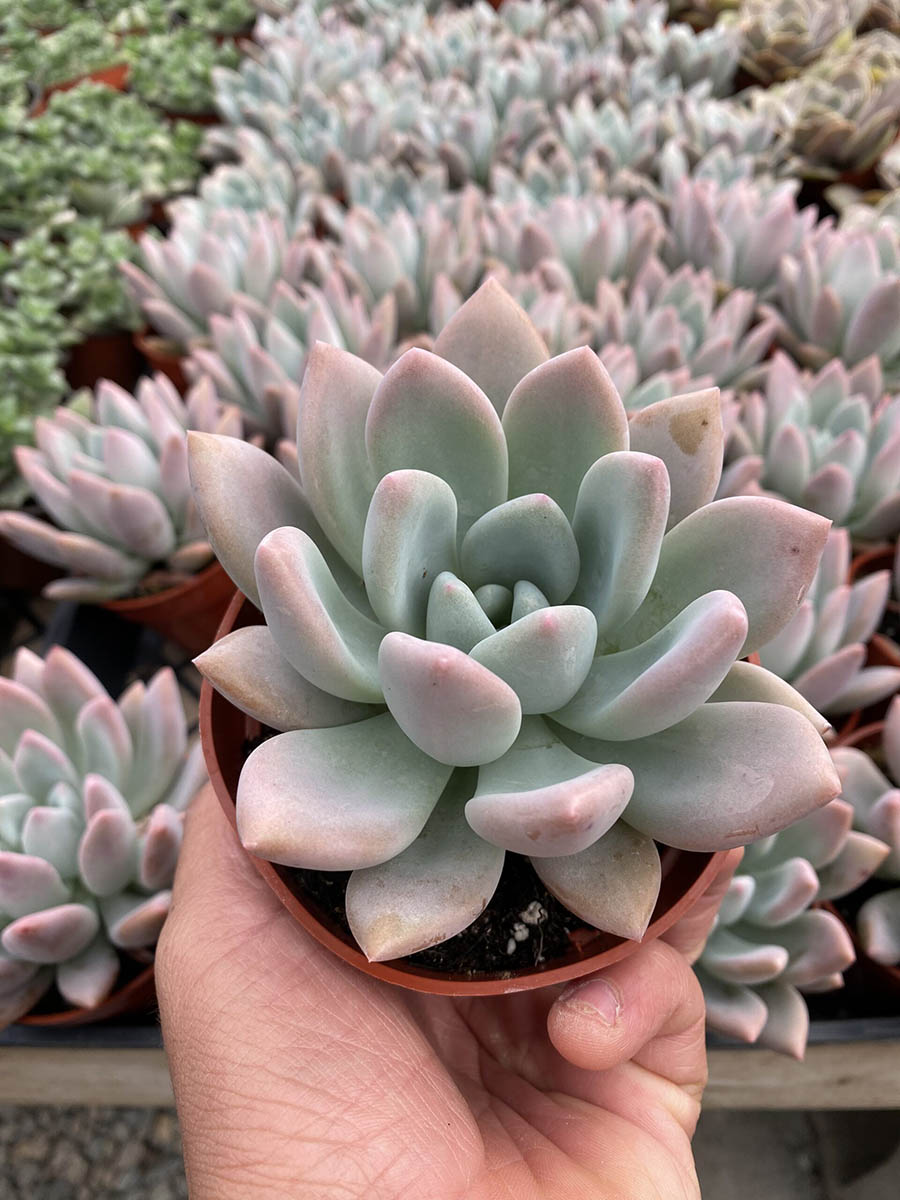 The Graptoveria Opalina features rosettes of pastel pink and blue-green leaves, creating a stunning color contrast. Perfect for interiorscapes and retail displays, its compact size makes it an eye-catching addition to succulent arrangements. With minimal water and bright light, this easy-care plant is ideal for beginners.