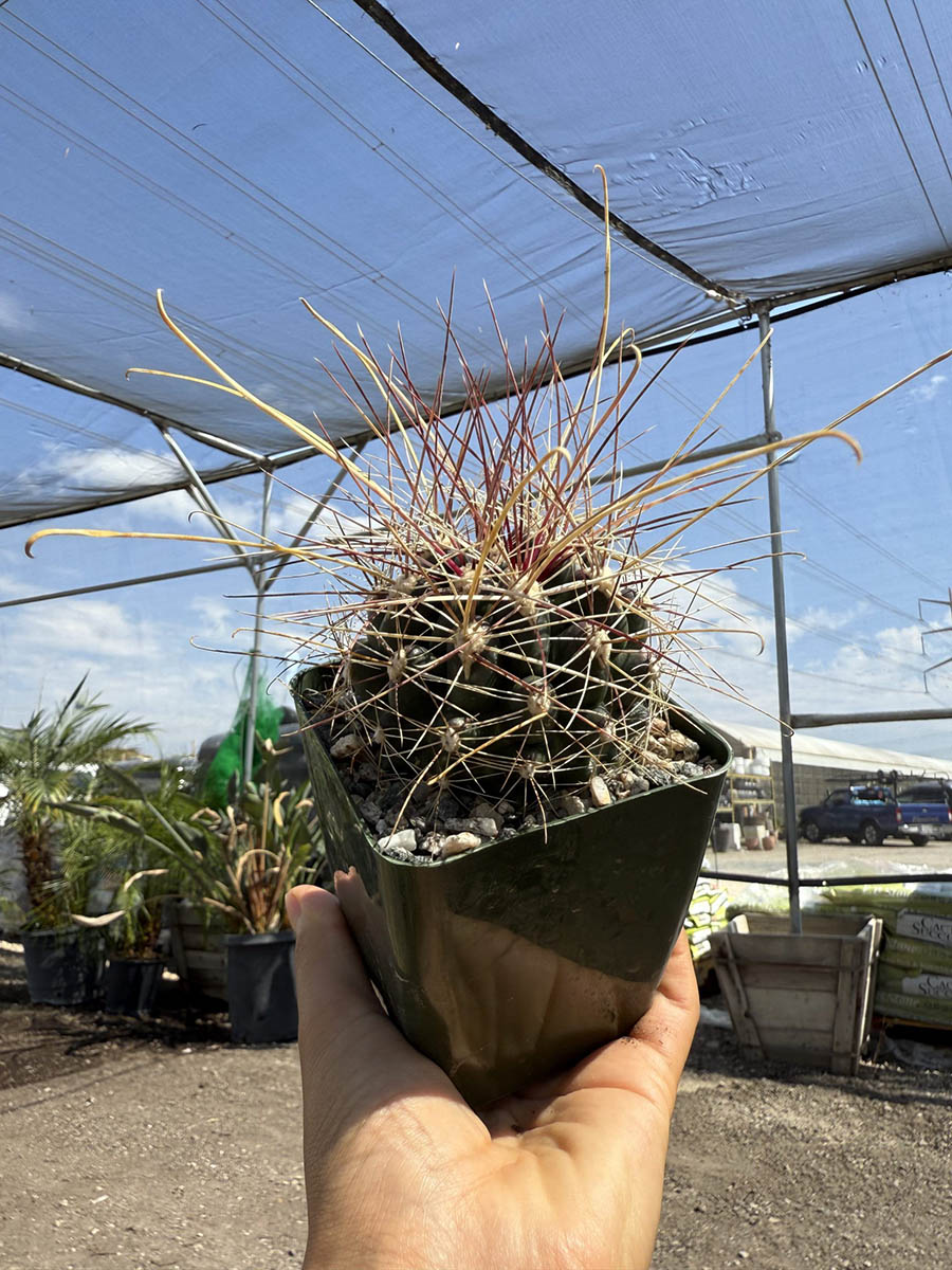 The Hamatocactus h. Davisii SQ features striking cylindrical stems adorned with bright red spines, creating a captivating visual contrast. Its compact size makes it perfect for interiorscapes or retail displays with limited space. Thriving in bright light and requiring minimal water, this cactus is a low-maintenance gem ideal for beginners.