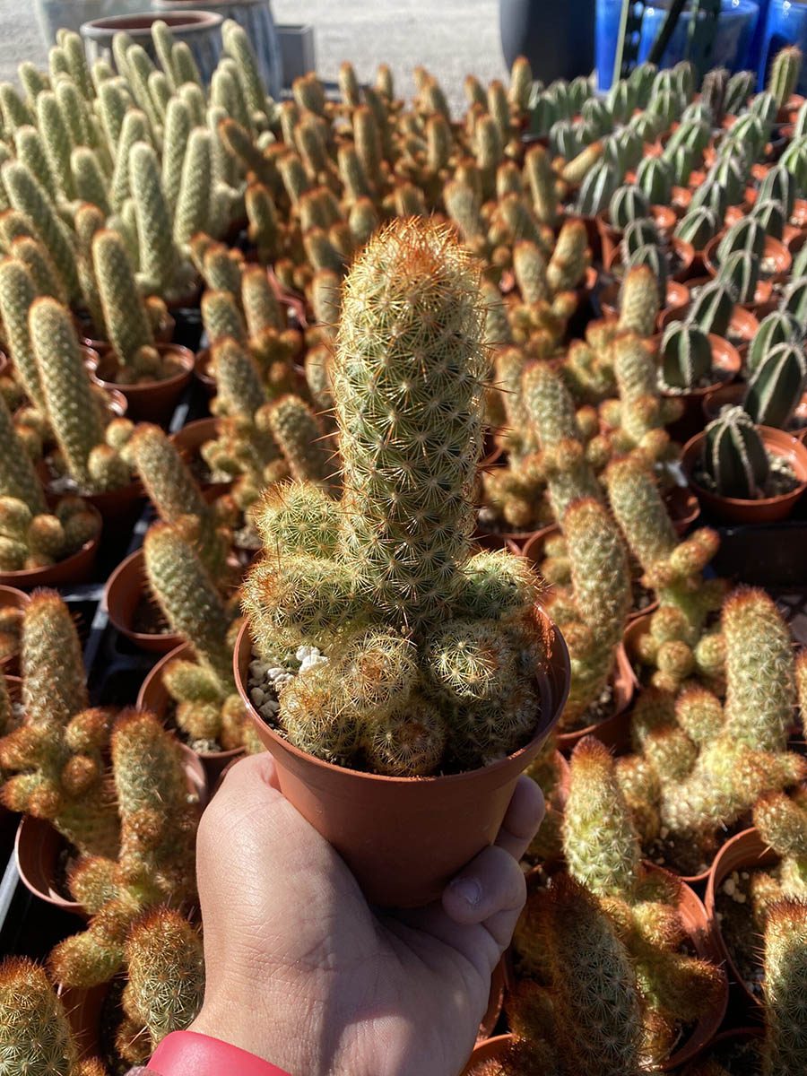 The Mammillaria Elongata Orange, commonly known as “Ladyfinger Cactus,” features cylindrical stems covered in golden spines that bloom into vibrant orange flowers. With infrequent watering needs and a preference for bright light, this cactus is ideal for both landscaping and retail displays. Its unique shape and stunning blooms make it a standout choice for creating desert-themed arrangements and adding a pop of color to any setting.