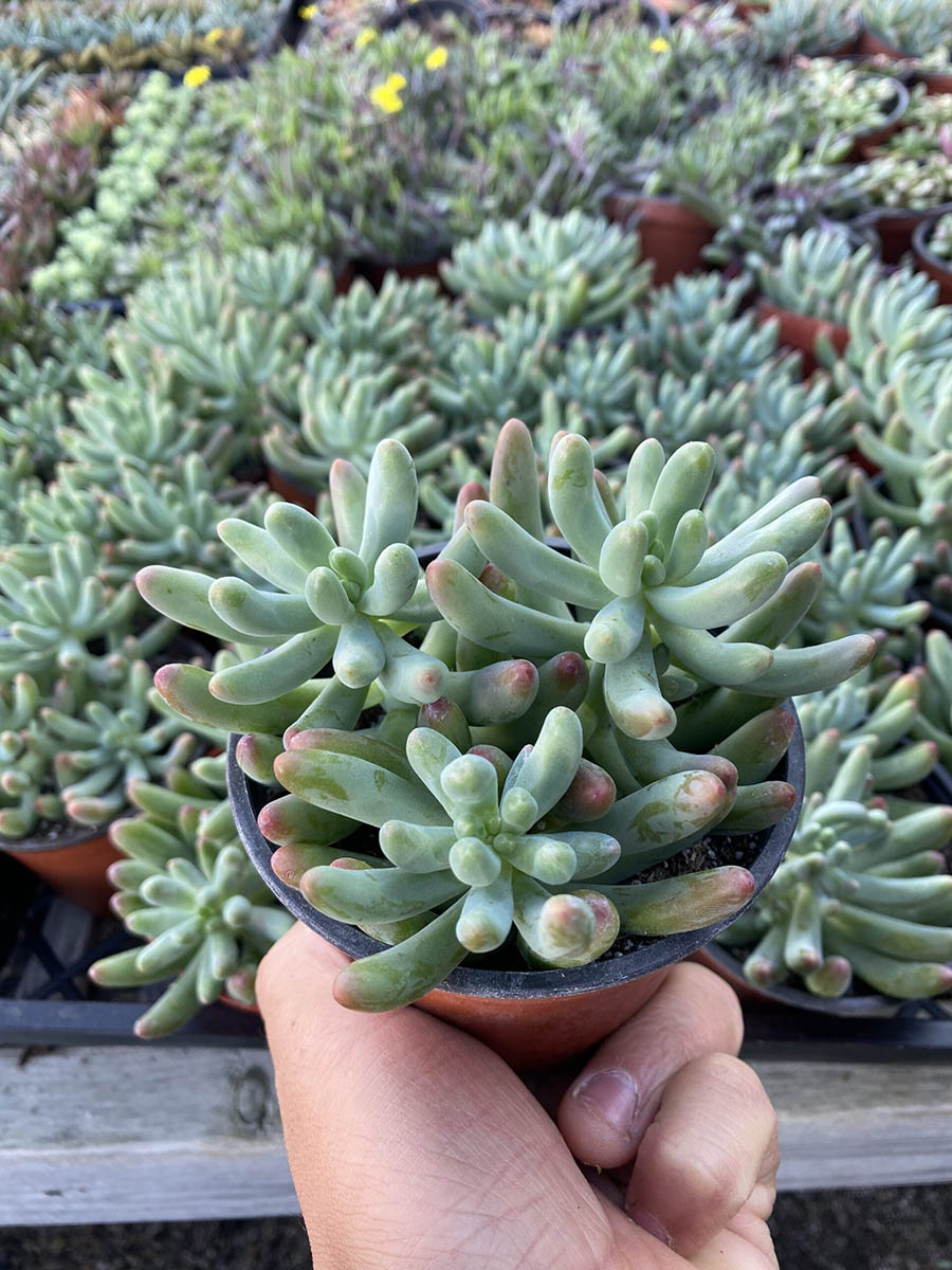 Sedum Pachyphyllum, also known as Jelly Beans, features chubby, jelly bean-like leaves that create a playful texture. This resilient plant is perfect for ground covers, containers, or rock gardens in various climates. With minimal water needs, it is a great choice for both busy landscapers and retail buyers seeking distinctive succulents.