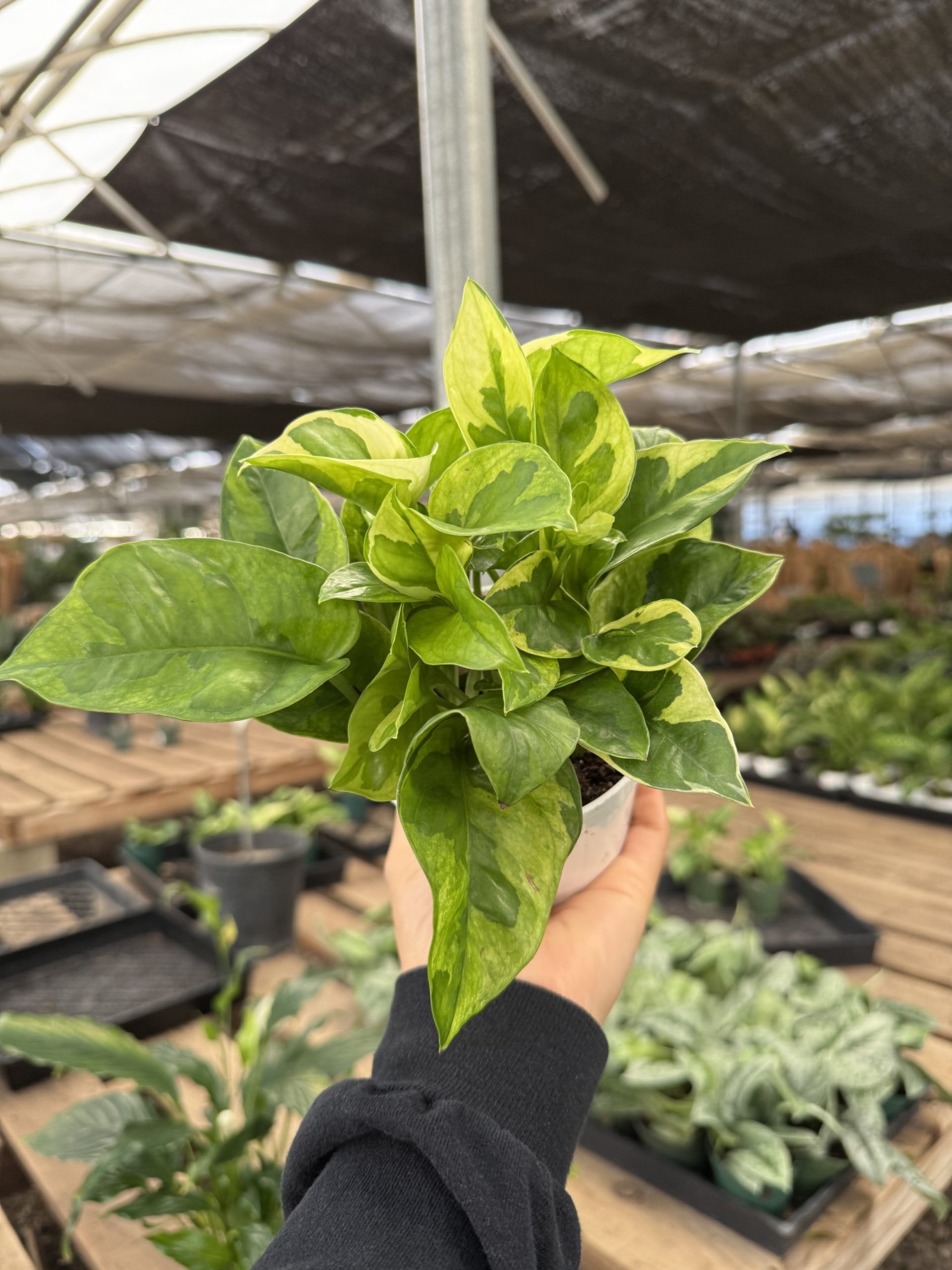 Elevate interior spaces and retail displays with the vibrant 4″ Pothos ‘Monet Sol’. Its glossy heart-shaped leaves feature a striking mix of green, yellow, and cream hues, creating a lively atmosphere. Perfect for both interiorscapes and retail shelves, this Pothos variety is easy-care, thriving in low light and requiring minimal watering. Ideal for beginners and plant enthusiasts seeking a splash of color.