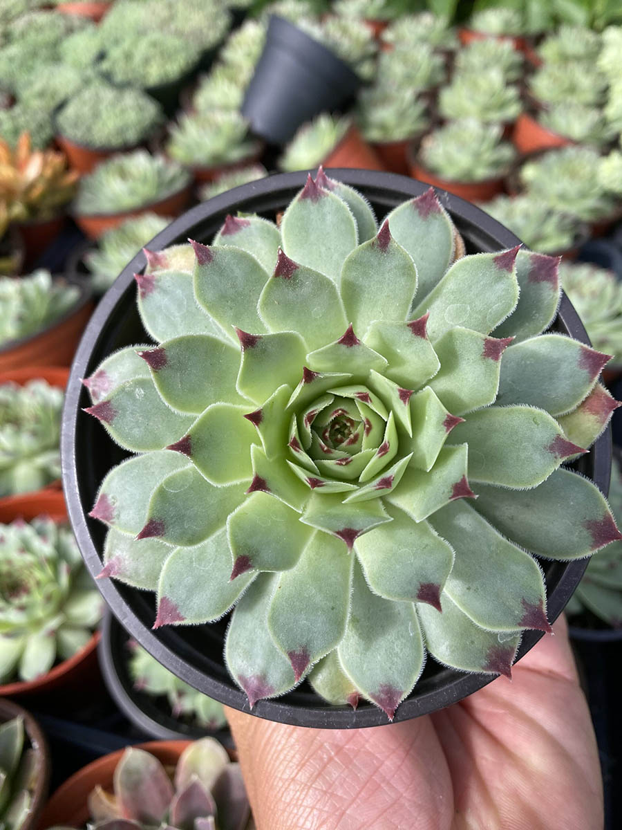 The 4″ Sempervivum Tectorum, also known as Common Houseleek, features rosettes of fleshy, pointed leaves in various shades of green and red. This hardy succulent is perfect for ground cover, rock gardens, and container arrangements, adding a pop of color and texture. With minimal water and bright light requirements, it suits both landscapers and retailers looking for low-maintenance options.