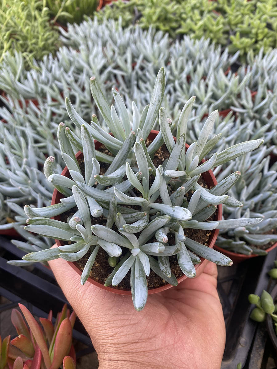 The Senecio Serpens, also known as Blue Chalksticks, features powdery blue cylindrical leaves that form a unique cascading pattern. Ideal for ground cover, erosion control, or adding a touch of whimsy to retail displays. Thrives in bright light conditions and requires minimal watering. Perfect for adding a touch of coastal flair to outdoor landscapes and retail setups.