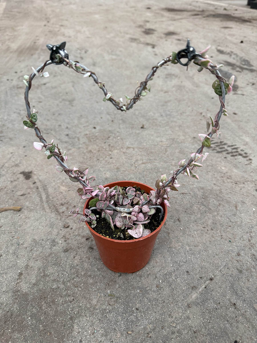 The 4″ String of Heart Variegated Topiary Heart showcases variegated green and white heart-shaped leaves, creating a beautiful contrast. This plant is a standout choice for interiorscapes and retail garden centers, thriving in bright light and requiring moderate watering. Its distinctive appearance and easy care make it a popular option for adding charm to various settings.