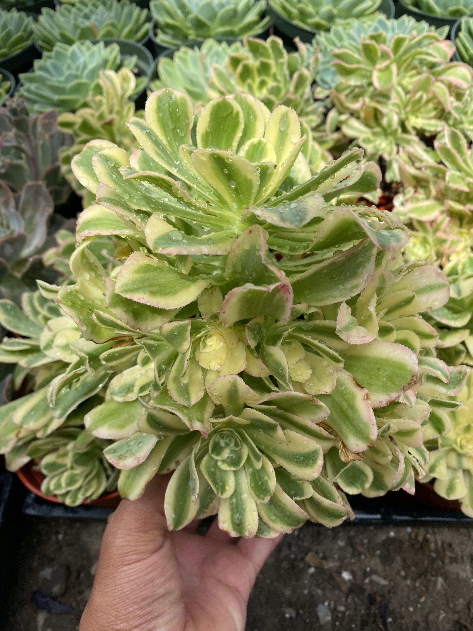 The Aeonium Arboreum boasts variegated leaves in shades of green, cream, and pink, adding a pop of color to any setting. Ideal for bright retail displays and low-light interiorscapes, this plant is easy to care for and requires moderate watering and light. Water: 2, Light: 3, General Care: 1