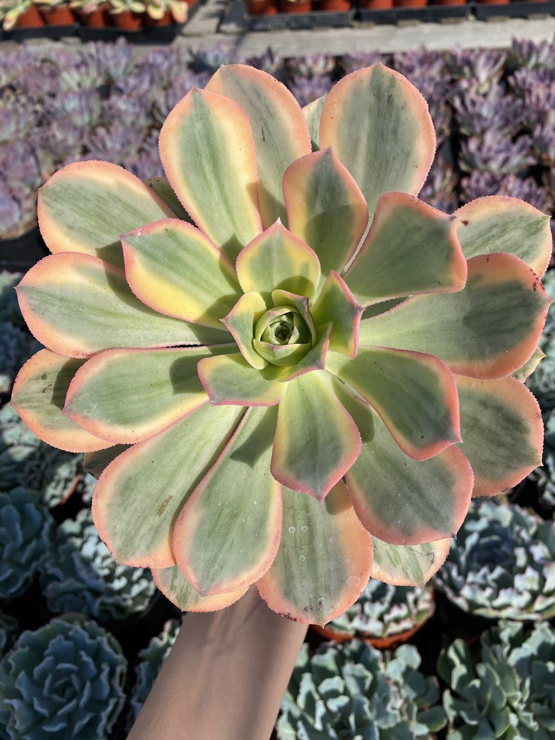 The Aeonium Sunburst showcases variegated foliage with vibrant tones of green, yellow, and pink. Its rosette shape and colorful leaves make it a standout choice for exterior landscapers seeking to create eye-catching arrangements in gardens or containers. Thriving in bright light and moderate watering, this plant is a great addition to landscapes looking to introduce pops of color and unique textures.