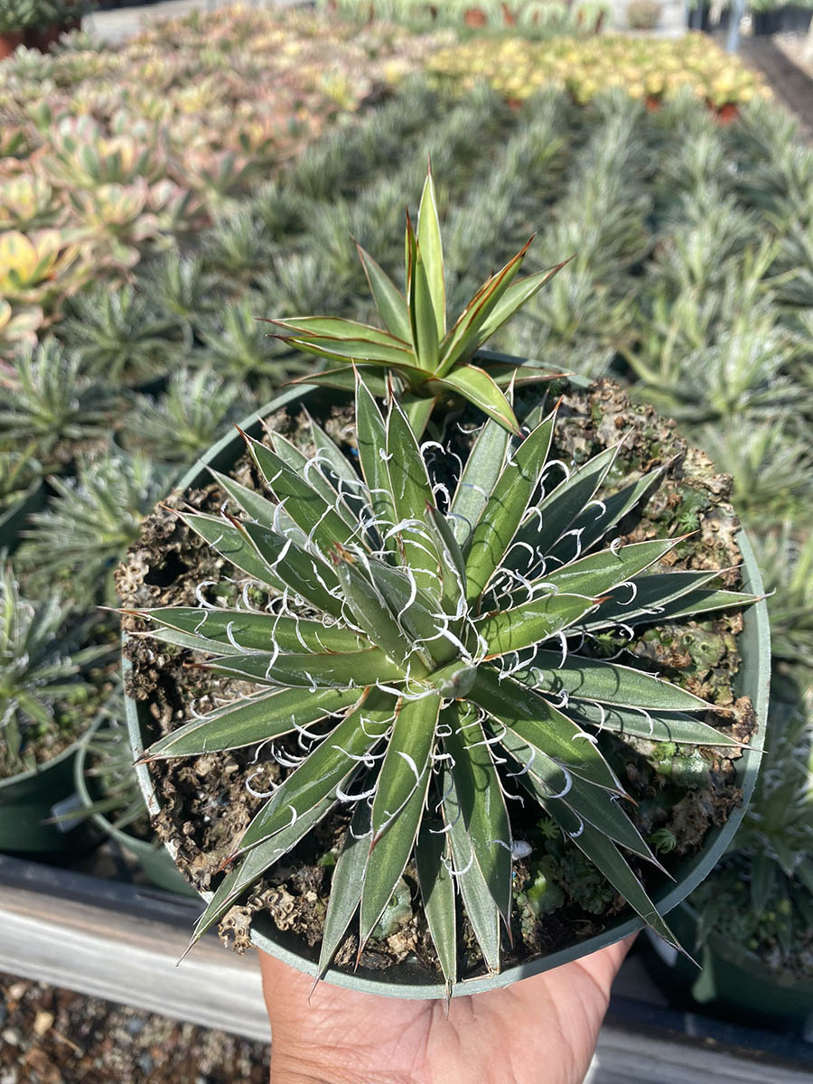 The Agave Leopoldii features stunning rosettes of blue-green leaves with delicate white markings, adding a touch of elegance to any landscape or display. Perfect for both exterior landscapes and retail centers, this resilient plant thrives in sunny spots and requires minimal watering. Ideal for creating eye-catching succulent arrangements.
