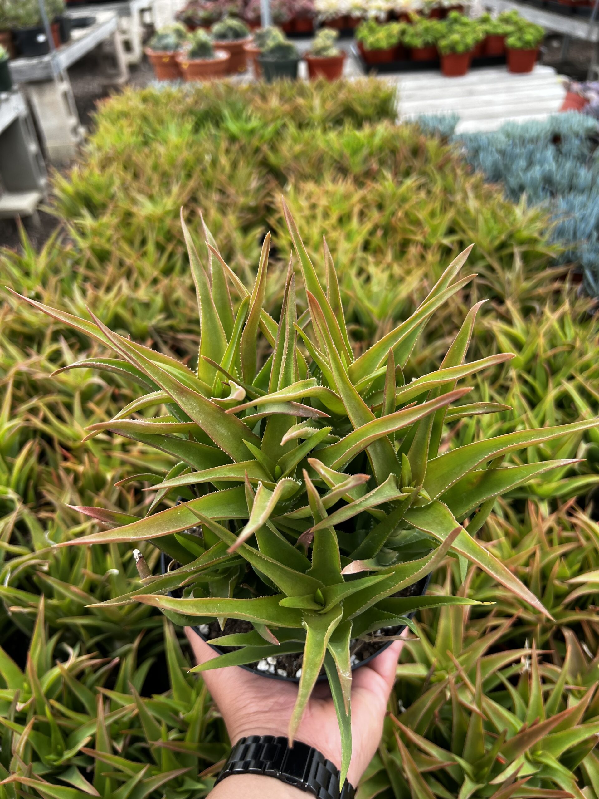A visually striking hybrid, the 6″ Aloe Green boasts vibrant green leaves with white speckles and a compact growth habit. Perfect for interiorscapes and retail displays, this aloe thrives in moderate light conditions and requires minimal watering. Ideal for beginners and adds a pop of color to any space.