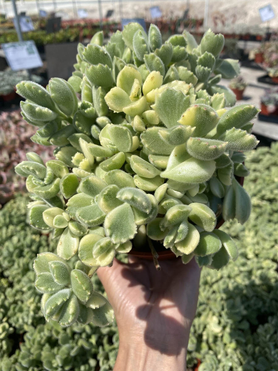 The compact 6″ Cotyledon Tomentosa Variegated is a versatile choice for both exterior landscapers and retail garden centers. Its attractive variegated foliage adds texture and visual appeal to landscapes and retail displays. With minimal water requirements and a preference for bright light, this plant is easy to care for and ideal for customers seeking low-maintenance options. Perfect for ground cover, rock gardens, or succulent arrangements.
